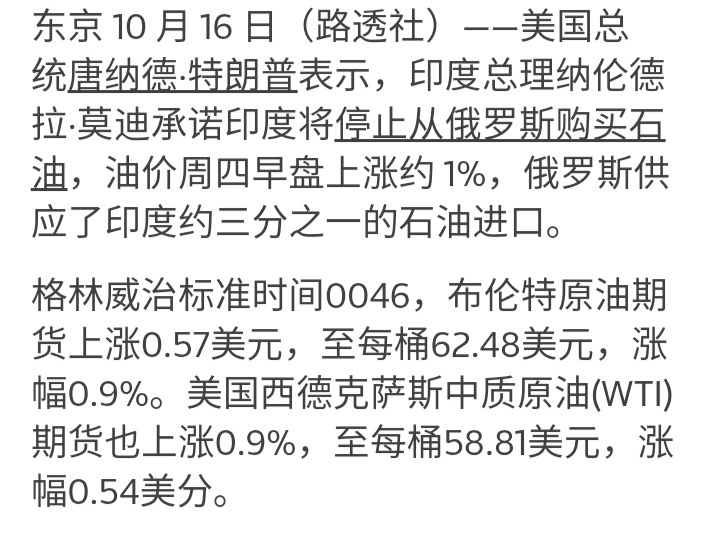俄乌冲突路透社:美国总统特朗普表示,印度总理莫迪承诺印度将停止从俄罗斯购买石油,油价周四早盘上涨约 1%,俄罗斯供应了印度约三分之一的石油进口。
