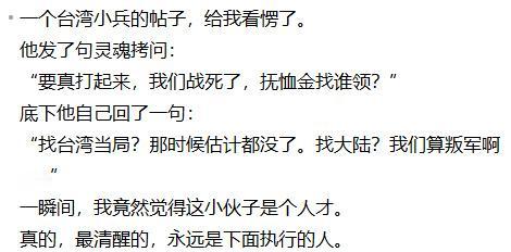 这个台湾小伙很清醒啊!看到网上的一个帖子(图二),有一个台湾小兵发了句灵魂拷问:要真打起来,我们战死了,抚恤金找谁领?底下他自己回了一句:“找台湾当局?那时候估计都没了。找大陆?我们算叛军啊! 瞬间,我竟然觉得这小伙子是个人才。 真的,最清醒的,永远是下面执行的人 西窗军备认为,岛内的不少群众其实是清醒的,何去何从自有分寸,所以还是建议小伙子们不如直接起义,把老赖绑起来,参照90多年前的一些经典案例,到时大功一件,还有奖励。