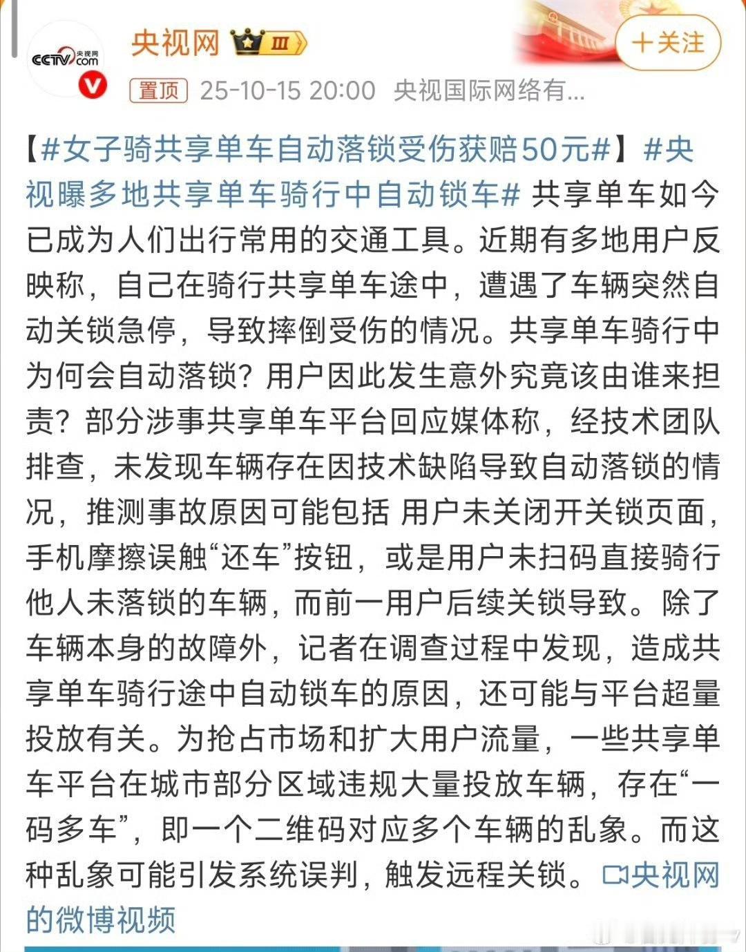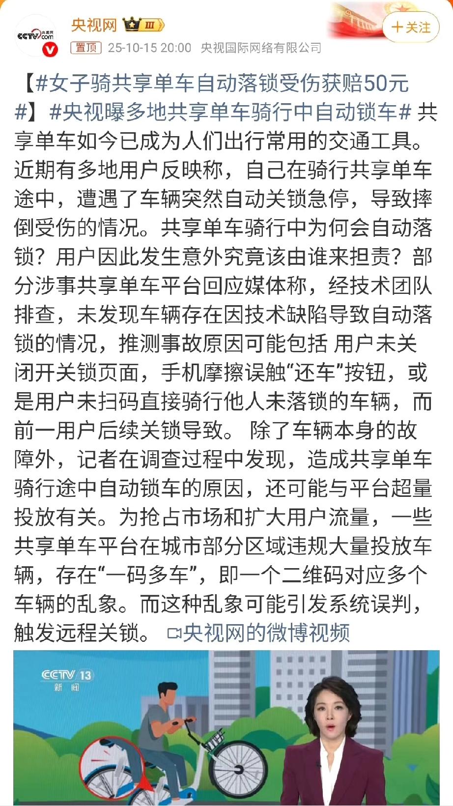 共享单车自动落锁伤人仅赔50元,平台的“无责”说辞你信吗? 最近好多共享单车自动落锁伤人的事挺闹心!一女子骑单车时车子突然自动锁死,女子直接摔得手臂膝盖都擦伤,最后平台就赔了50块钱。 你说这共享单车好好的,咋就突然锁车了?平台还说没技术问题,要么是用户手机误触还车键,要么是骑了别人没锁的车,或者前一个用户后来车上锁了导致的。 但你仔细想想,还有平台超量投放的惹的祸。为了抢市场,有的平台一个二维码对应好几辆单车,搞“一码多车”。连系统一看都懵了,就误判远程锁定单车,管理是才骑还是没有骑单车,这不就坑了骑车的人嘛。 咱老百姓骑车就图个方便,结果还得担惊受怕。要是真遇上这种事,可得赶紧保留好证据维权。也希望平台能好好管管,别光顾着抢地盘,把用户的安全扔在一边。骑单车被抢 共享单车骗局 共享电动车保险 行人判赔 共享单车罚款 盗窃共享单车 电瓶车赔偿 共享单车运营方 信息来源:央视网