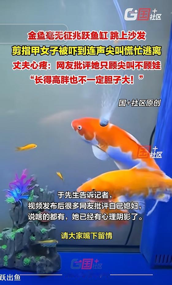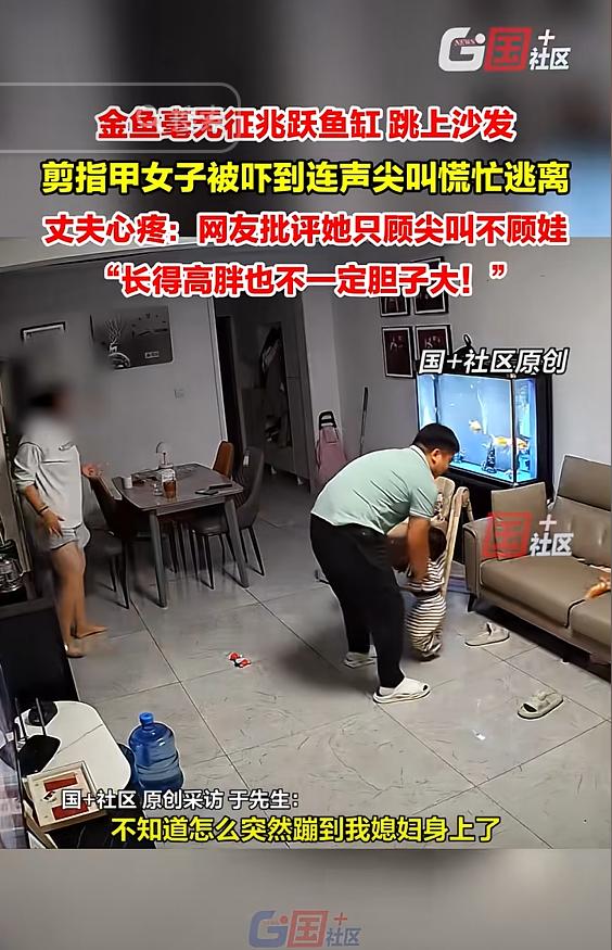 山东济南,女子坐家中沙发上剪指甲,突然发觉掉身上一个东西,还在甩尾挣扎,她看了看,吓得尖叫逃离,一点没顾旁边的孩子,丈夫赶紧上前处理,更想不到的是,事后女子还被网友批评了! 10月9日,根据丈夫放出的监控视频,能看出妻子当时在沙发上剪指甲,丈夫在鱼缸前玩手机,孩子好奇的看着鱼游来游去。 女子吓得起身后,孩子那会一点也不怕,还凑过去看沙发上的鱼,可妻子的尖叫声还没停,丈夫眼疾手快,将鱼一把抓住放回了鱼缸,刚才还默不作声的孩子,被妻子的声音吓哭了。 有网友表示,女子的反应也太过夸张了,明知道是自家养的鱼,第一下好啊可以理解,后面知道了,就该安静点了。 毕竟孩子还小,吼这几嗓子,把孩子吓哭就不好了。 丈夫也在网上回应,自己妻子外表看着爽朗,却不一定胆子大,希望大家嘴下留情,不要再批评他的妻子了。 有人恐猫、有人怕狗,对鱼有畏惧也属正常,女子自己吓跑了,没有管孩子,也许是因为孩子不怕鱼,大家也不用揪着不放。 视频里孩子凑过去看鱼时,丈夫就在旁边盯着,眨眼间就把鱼抓回去了,从头到尾孩子没受一点伤,就是被妈妈的尖叫惊着了,但妈妈也很快抱住了孩子,给他安慰,孩子也镇静了下来。 要是当时丈夫不在场,说不定这名妈妈就能冷静下来,自己想办法处理了。 最后妈妈抱着孩子,爸爸观察着鱼回到鱼缸的状态,孩子也没有真的被吓到,家庭氛围还是很温馨的。 他们也安抚了孩子的情绪。 其实妈妈也有弱的时候,不会因为当了妈妈,就刀枪不入,怕什么东西是她的本能,只要没有造成什么严重后果,都不必过分苛责。 很多时候,我们总默认父母该是孩子的 “全能守护者”,却忘了他们也是有恐惧、会慌乱的普通人。 其实对特定事物的畏惧本就不分性别与身份,就像有的人恐高,是无法克服这种恐惧的,只要没有造成实质危害,这种本能反应更该被心疼,而非苛责。 这就是件家庭里的小插曲,鱼没事,孩子没事,说不定后来提起来,夫妻俩还会觉得好笑。 其实这就是最亲近的家人,包容彼此的 “不完美反应”,才是家最真实的样子。 对于这件事,你怎么看? (来源:国+社区 10月9日,山东济南,金鱼毫无预兆跃出鱼缸,正剪指甲女子冷不丁被吓,一边尖叫一边逃离,随后遭网友批评自私不顾娃。丈夫心疼:长得高胖也不一定胆子大!)