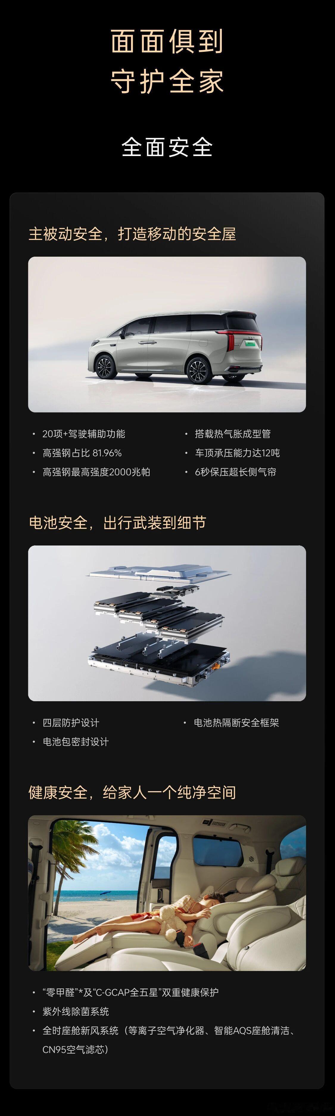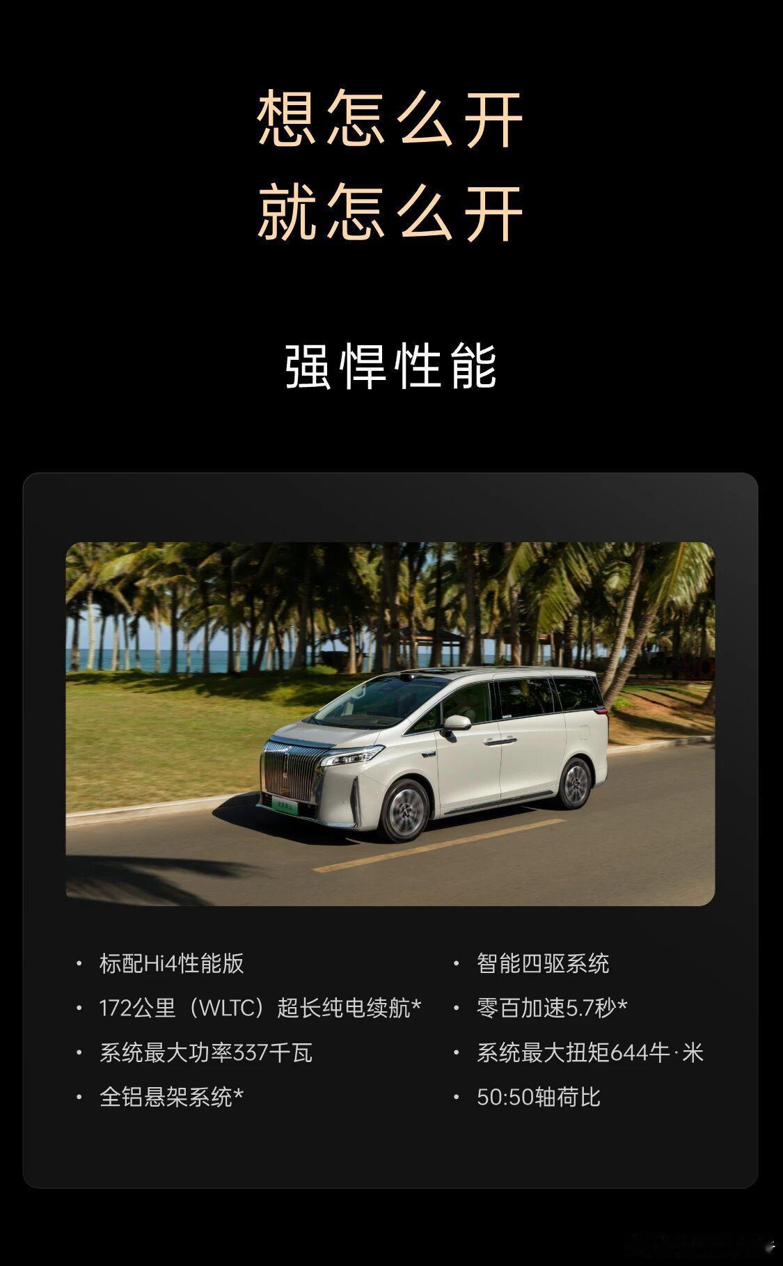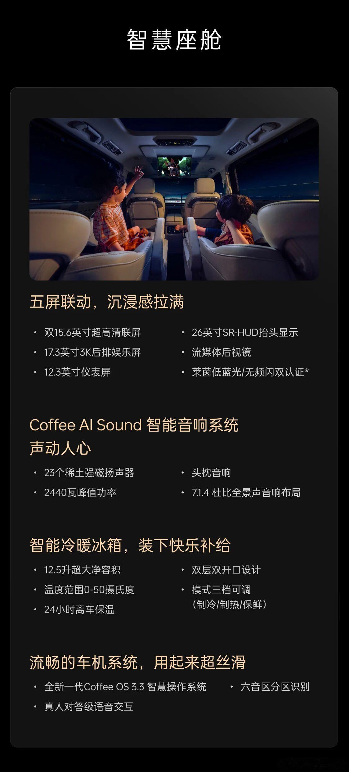 内饰方面,延续了高山8,前排将配备12.3英寸仪表屏+双15.6英寸中控屏与副驾屏+26英寸抬头显示,搭载车规级8295芯片,并采用Coffee OS 3.2智能操作系统,并支持HiCar、Carlink、CarPlay手车互联功能。