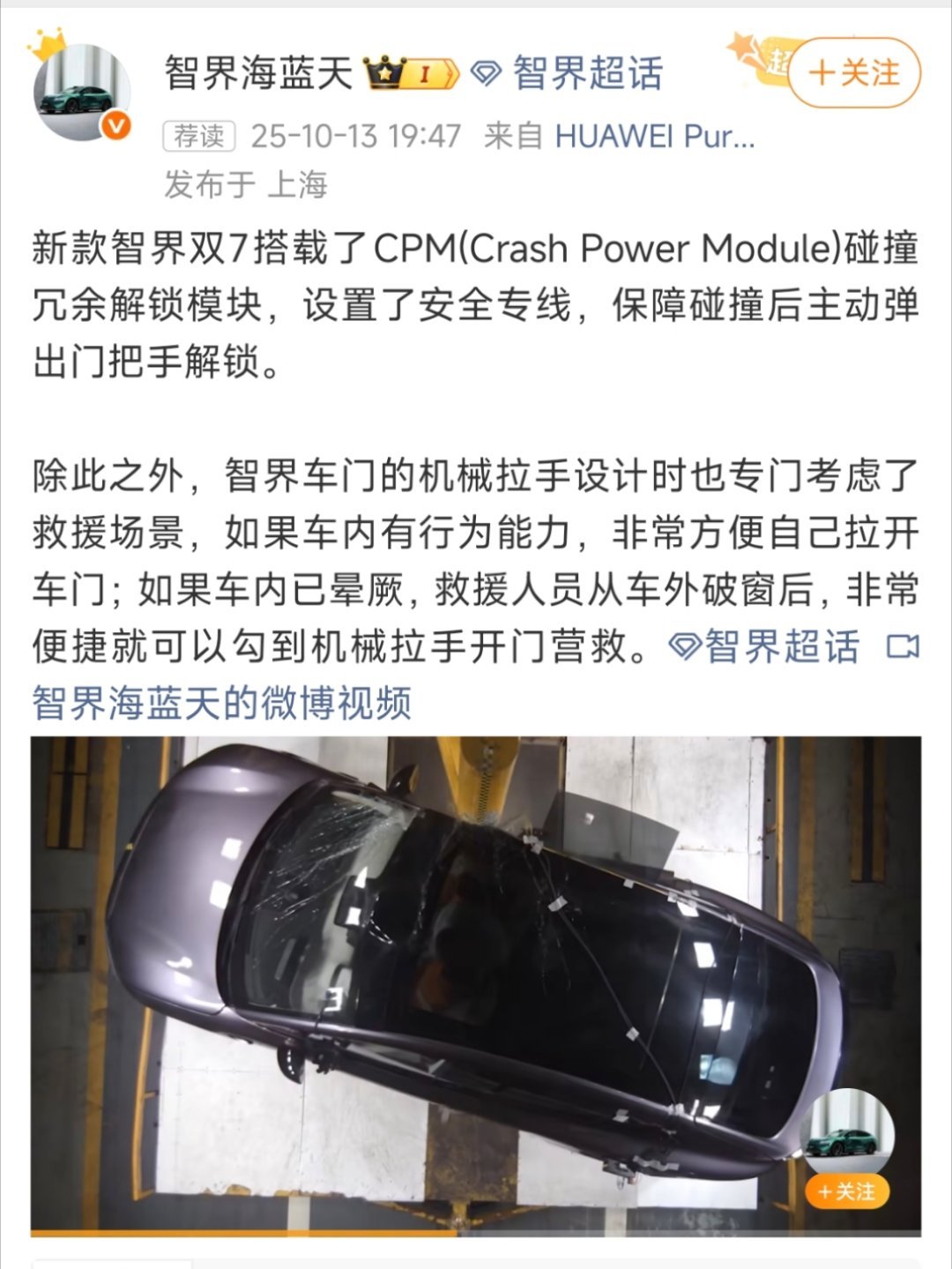 智界的测试,前面碰撞车速40,侧面32,后方来车80,测试的CPM。
