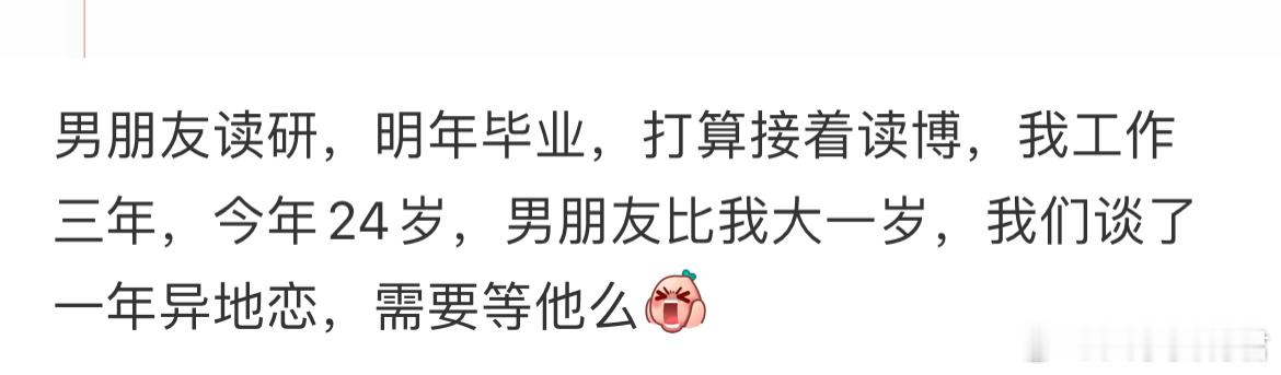 男朋友读研,明年毕业,打算接着读博,我工作三年,今年24岁,男朋友比我大一岁,我们谈了一年异地恋,需要等他么? ​​​
