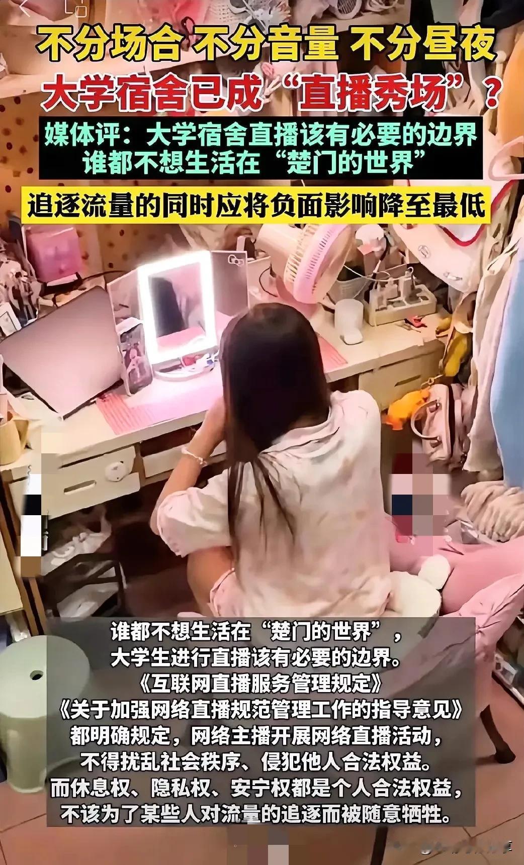 大学生宿舍成直播秀场“重灾区”? 这世界终究还是癫成了我们不认识的模样! 近日刷到一则视频,大学四人宿舍,全员“网红”! 大学生搞直播本来无可厚非,利用自己的闲暇空余时间,补贴家用很正常,也很鼓励!但是,不分时间的昼夜直播,全员活在楚门的世界,真的好吗? 只要还是学生,当前最主要的应该还是学习吧。为了直播当网红,日夜颠倒,把身体熬坏了不说,连学业也荒废了,这样真的值吗? 学校是学习的圣地,除了学习知识以外,更重要的是学做人,啥都没学会,学别人直播做网红,父母的心都在滴血吧! 大家觉得呢?宿舍舍友直播