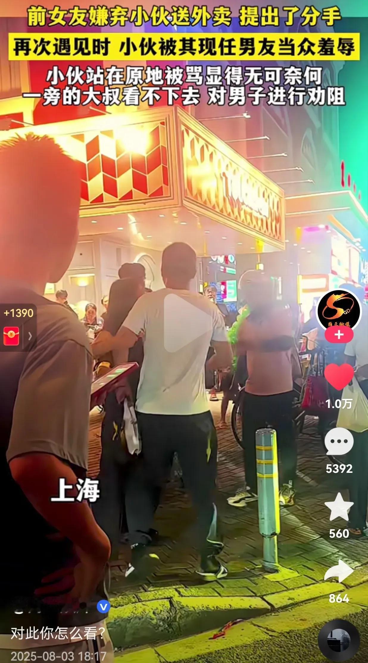 真的是杀人诛心呐!一女子嫌弃自己的男朋友是送外卖的,提出了分手。没想到再次相见时,小伙被其现任男友和前女友当众羞辱,小伙站在一旁被骂的无可奈何。一旁的大叔看不下去,对男子进行劝阻。没想到的是,男子依旧是不依不饶。网友:真的是“不是一家人,不进一家门。” 网友评论: “她的现任男友对小伙子也是冷嘲热讽,当众羞辱小伙子”,这小伙子太老实,其实他只要一句话:我吃过的剩饭剩菜香吗? 文中被欺负的小伙,不应该算是老实人,应该是愧疚、懦弱、无能。为什么这么说哩,他应该值得谴责的错误有这么几点:其一,人家大好韶华的姑娘,轻易托付给他一段时间,这应该算是浪费了前女友的青春;其二,遇到前女友及前女友现任男友对自己的攻击,一味的忍让,这是一个连对待自己都没有担当态度的人;其三,本来与前女友巳经分道扬镳、桥归桥路归路了,怎么可以忍受前女友的现任,无端的践踏自己尊严和无端的欺辱。与前女友再次的相遇,所遭受的挑衅和羞辱,还是可以理解一二,正所谓爱得越深、伤得越重。但是前任的现任,给予他的欺辱,应该是毫无道理可言的,只能说是懦弱加无能的表现。