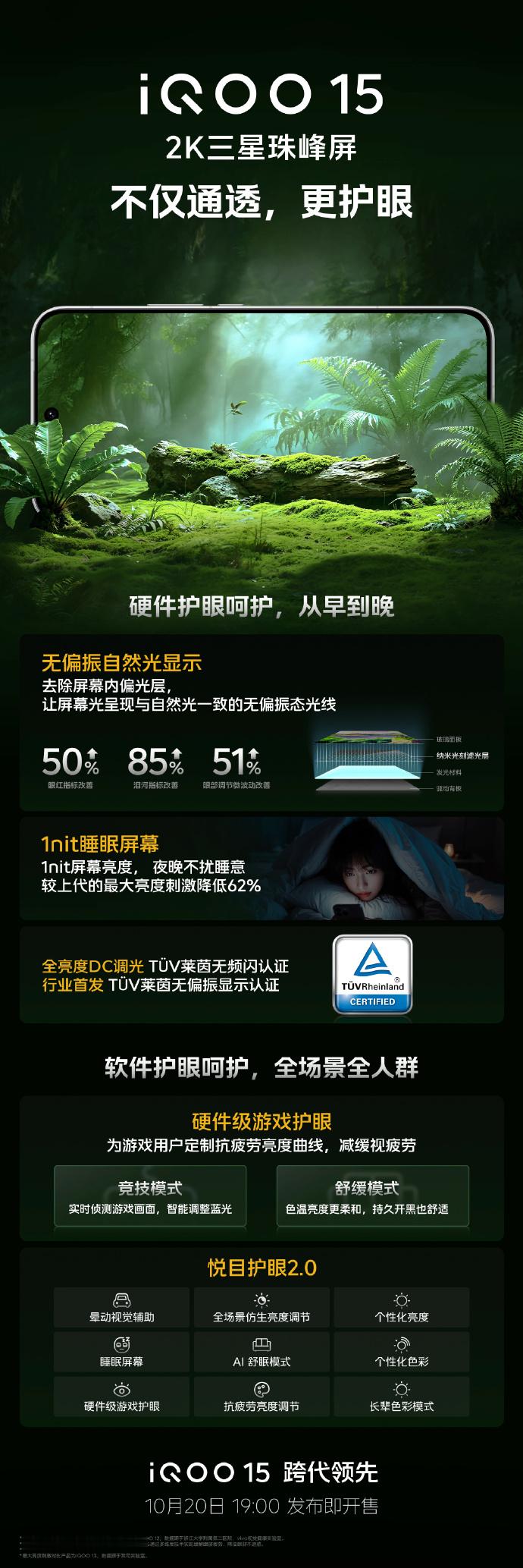 iQOO 15还搭载三星2K LEAD OLED技术,全系标配 AR超清增透保护膜技术,配合三光敏传感器,亮度方面 6000nits 局部峰值亮度,2600nits 全局峰值亮度,1000nits 手动峰值亮度,无偏振自然光显示+全亮度DC调光+悦目护眼 2.0,屏幕显示素质提高,功耗降低,更加护眼