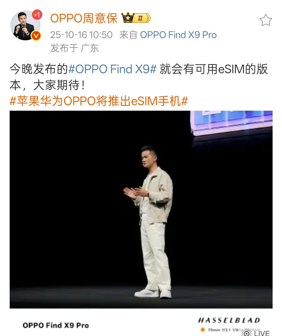 苹果华为OPPO将推出eSIM手机应该是华为Mate80系列有可能?OPPO周意保表示今晚发布的OPPO Find X9系列就会有可用eSIM的版