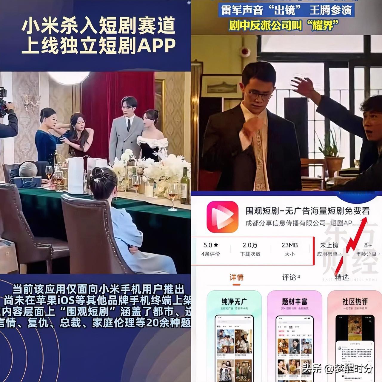 我有预感 短剧行业又要大变天了! 不是被广电制裁了,而是小米也杀入短剧赛道了! 近日,小米正式上线独立短剧APP-围观短剧,迅速吸引了很多人关注,目前该APP下载量已达2万人次 看了一下,不仅没有广告免费看,而且题材丰富,基本热门短剧都有,这不彻底秒杀那些付费观看的短剧平台! 而之前就早有铺垫, 7月份小米出品首部短剧《时空合作人》,王腾还亲自参演。 不得不说,雷军还是太全面了,从手机、汽车,到现在短剧,样样可以做到行业顶尖。 这两天也是真热闹啊,京东要造车了,小米要做短剧了 大家怎么看?
