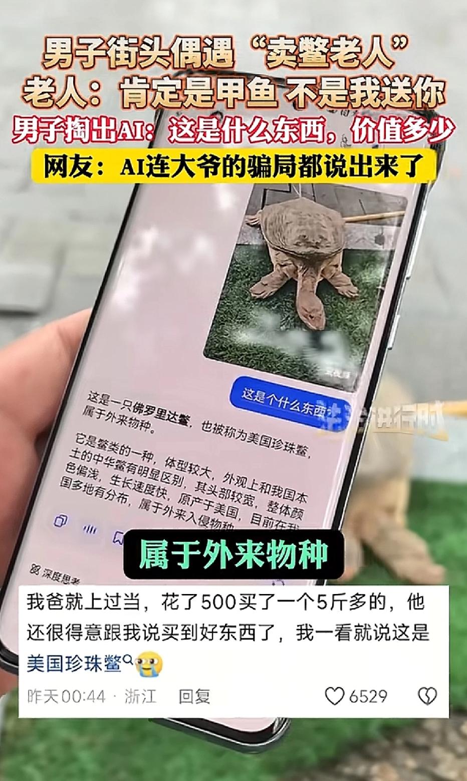 “豆包立功了”。男子在街上碰到一位穿着朴素的大爷,正用扁担挑着一只龟叫卖。男子好奇发问:“这是什么?” 大爷回应道:“这是甲鱼啊。”男子接着问:“从哪儿来的?多少钱?” 大爷说:“干活挖出来的,1300元。” 男子面露疑惑,大爷信誓旦旦的说:“这百分百是甲鱼,要是假的我白送你。” 男子觉得是龟,大爷坚称是甲鱼,他便拿出手机拍照上传到豆包。豆包告知男子:“这是美国珍珠鳖,属于外来入侵品种,生长速度快。” 豆包还进一步说明:“正常价格在20到30元之间,不过在街头售卖时,很多骗子会把它当甲鱼卖,售价高出数倍。” 大爷站在一旁,脸色瞬间变得苍白。 男子对大爷说:“我建议你别在杭州有这种行为。” 大爷默默扛起“甲鱼”离开了。 其实男子早就看出大爷是卖“甲鱼”的骗子,全程都录了像,还借助豆包揭穿了大爷的骗局。 有网友评论:“我爸爸就被这种街头骗局骗了500元。” 如今,手机已成为生活中不可或缺之物,豆包这几年也融入大众生活。因其使用便捷,已取代百度识万物的功能,成为大众新宠。 在人工智能时代,无论年纪大小,当你无法分辨事物好坏对错时,不妨用豆包搜一搜,以免犯错或上当。 每个人在使用的过程中,也是帮着豆包完善功能,毕竟这是我们的豆包。 来源:法治进行时