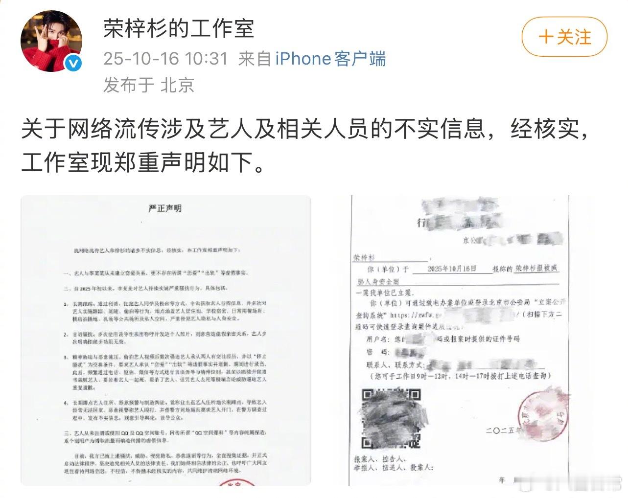对于被指恋爱劈腿打人,荣梓杉工作室回应:艺人与李某某从未建立恋爱关系,更不存在所谓恋爱、出轨等虚假事实
