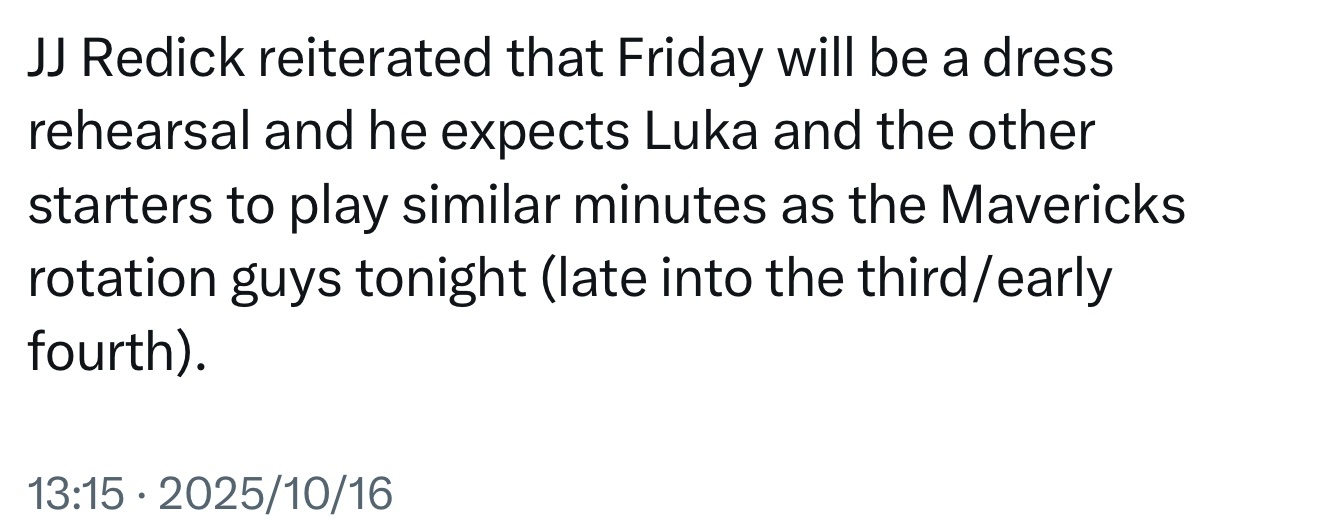 预计东契奇与其他首发球员的出场时间会与今晚独行侠轮换球员的作战模式相近(持续到第三节末/第四节初)。