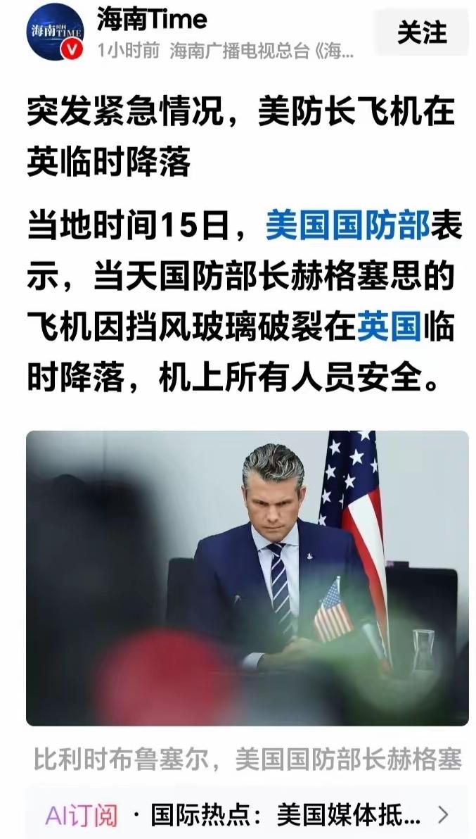 最新消息 当地时间15日,美国国防部长赫格塞思乘坐的专机,专机挡风玻璃碎裂,无法飞行,赫格塞思被迫换乘另一架专机,赶往英国出席北约会议,随后专机紧急迫降英国,专机由美国空军安排。 美国国防部长赫格塞思乘坐的专机挡风玻璃碎裂,无法飞行,赫格塞思被迫换乘另一架专机,赶往英国出席北约会议,随后专机紧急迫降英国。 该专机由美国空军安排,有可能是空军高级将领对赫格塞思不满造成的,但不太可能有人对该专机动手脚。 该事件与发生在1975年8月的“基辛格事件”很相似,但“基辛格事件”是CIA动手搞的,而本事件不太可能是因为空军高级将领对赫格塞思不满而搞的阴事,因为搞阴事是犯法的,很可能是空军安排的专机出现了技术故障。 本文作者:老李 编辑:老李 发布平台:百家号