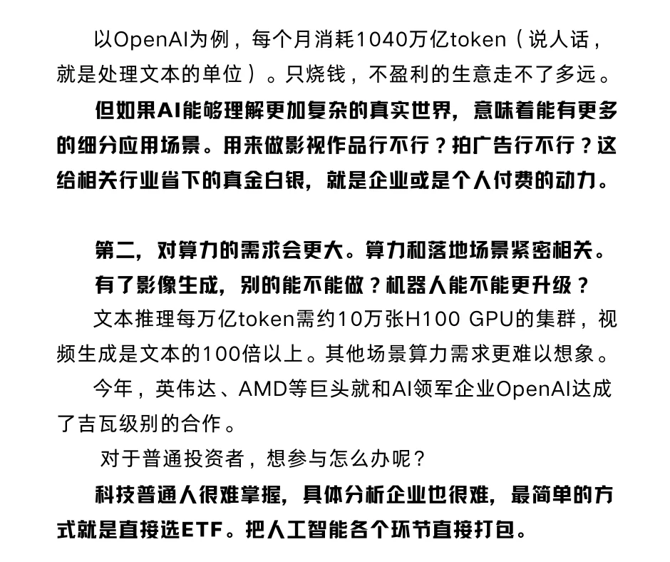 文本推理每万亿token需约10万张H100 GPU的集群,视频生成则是文本的100倍以上。其他场景算力需求更是难以想象。