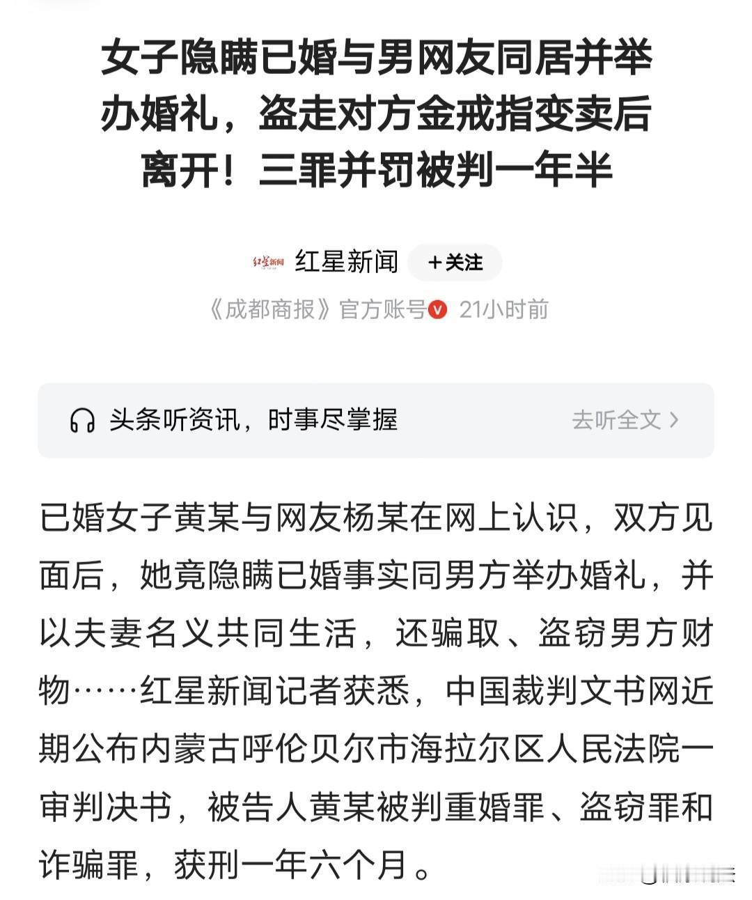 内蒙古,已婚女子和网上认识的男子谈起了恋爱,相约到某地和男子同居3个月,期间女子怀孕了,男子提出结婚,女子隐瞒已婚和男子举办了婚礼,婚后,女子用手段骗取男友10000元,之后,又将男友所有金戒指偷走,变卖7168元,又隐瞒流产以孕检为由骗取男友1000元,男友终于发现被女子骗了,报了警,让女子付出了代价。 黄某是一名90后,小学文化,也没有个正经工作,闲来无事她喜欢在网上聊天,2023年6月,她在网上认识了一个叫杨某的男子,二人相谈甚欢。 两人聊出感情后,约好在海拉尔见一面,见面后两人互生好感,很快就确定了恋爱关系。 最美不过乍见之欢,黄某干脆和杨某同居了,两人住一起三个月,这期间,黄某发现自己怀孕了。 杨某喜出望外,他当爸爸了,他主动向黄某提出结婚,想有一个家。 黄某有些意外,没想到杨某这么诚心,但是,她也有些焦虑,毕竟她是已婚妇女了,如果和杨某说实话又怕他有想法。 于是,黄某就没有告诉杨某自己其实已经结婚了。 2023年12月30日,黄某和杨某在海拉尔的某个酒店举办了一场热闹的婚礼,此后,两人以夫妻名义一起生活。 然而,黄某并不安分,2024年1月2号,黄某骗杨某说,姐姐黄某乙要借1万块钱。 杨某觉得自己媳妇儿姐姐张口了,这个忙得帮。 可杨某哪里知道,黄某和姐姐撒谎说,杨某要给她1万元买保险,不过,自己的微信不能收钱,让姐姐帮忙收一下。 姐姐黄某乙也被蒙在鼓里,她收了杨某转的1万块钱。 黄某就让姐姐在将这1万转到自己的支付宝里。 黄某一番操作,1万块钱到了手。 黄某手里多了一万块,自然是瞒不住杨某的,不过,她骗杨某说这1万是父亲给杨某的改口费,之后,这笔钱她和杨某一起用做日常花销了。 杨某信以为真,对自己媳妇也没有一丝防备。 谁曾想,同年5月26日,看杨某出门后,黄某偷偷打开抽屉,把杨某所有的金戒指偷走,拿去金铺变卖,买了7168元,之后日常花销了。 当天,黄某卖完金戒指后,一个人离开了海拉尔,此后,她再也没有和杨某共同生活了。 7月13日,黄某故技重施,她把孩子流产了,却没有告诉杨某,反而说她要做孕检,和杨某要了1000块钱,钱一到手,她就拿去消费了。 最终纸包不住火,杨某终于发现自己被黄某骗了,一气之下他选择了报警。 黄某终将要为自己的行为付出代价,她分别犯了重婚罪、诈骗罪和盗窃罪,法院会怎么判呢? 1、黄某明明有配偶,却与杨某以夫妻名义共同生活,构成重婚罪。 《刑法》第258条规定:有配偶而重婚的,或者明知他人有配偶而与之结婚的,处二年以下有期徒刑或者拘役。 本案中,黄某在已婚状态下,隐瞒已婚事实与杨某举办婚礼并以夫妻名义同居。 即使二人未领取结婚证,但公开以夫妻名义生活,二人在海拉尔某酒店举办了婚礼、以及共同居住,仍可认定为事实重婚。 法院据此认定黄某构成重婚罪,体现了对婚姻忠诚义务的维护。 2、黄某虚构事实,以非法占有为目的骗取杨某1万余元,构成诈骗罪。 《刑法》第266条规定:诈骗公私财物,数额较大的,处三年以下有期徒刑、拘役或者管制,并处或者单处罚金。 第一,黄某隐瞒已婚事实,与杨某举办婚礼并以夫妻名义共同生活,构成对婚姻状况的虚假陈述。 第二,黄某谎称姐姐借款、父亲给改口费等,虚构事实骗取杨某财物。 第三,黄某隐瞒孩子流产的事实,以做孕检为由骗取杨某钱财。 黄某将骗取的财物用于个人消费,如日常开销、个人花费等,表明其具有非法占有的目的。 另外,黄某在骗取杨某财物后离开海拉尔,再未与杨某共同生活,进一步证明其非法占有的意图。 3、黄某偷走杨某所有金戒指拿去变卖,构成盗窃罪。 《刑法》第264条规定:盗窃公私财物,数额较大的,处三年以下有期徒刑、拘役或者管制,并处或者单处罚金。 经认定,该戒指价值人民币8226元,已达到盗窃罪中“数额较大”的标准。 本案中,黄某趁杨某出门工作时,偷走其放在家中抽屉内的金戒指,并出售获利用于个人消费,表明其具有非法占有的目的。 而且,黄某在杨某不知情的情况下,将杨某个人所有的金戒指偷走,符合盗窃罪中“秘密窃取”的行为特征。 2025年8月18日,法院判决:黄某犯重婚罪,判拘役6个月; 犯诈骗罪,判处有期徒刑1年,并处罚金3000元; 犯盗窃罪,判处有期徒刑1年,并处罚金2000元。 数罪并罚,决定执行有期徒刑1年6个月,并处罚金5000元。 责令黄某退还杨某19226元。 黄某她对婚姻不忠,欺骗了杨某的感情和钱财,最终付出了代价。 成年人对自己的婚姻应该保持忠诚,这不仅是法律赋予的义务,也是对另一半的尊重任何背叛都将付出惨痛教训。