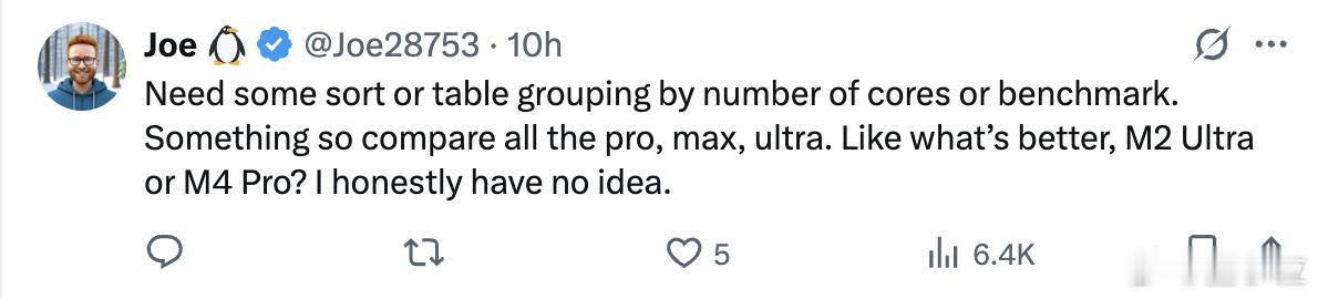 - 整个M系列已经乱套了,M4 Max > M5 > M4 > M3 Ultra?看不懂了;