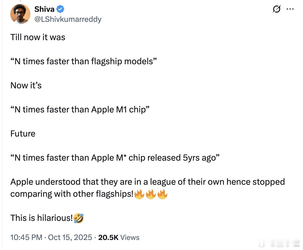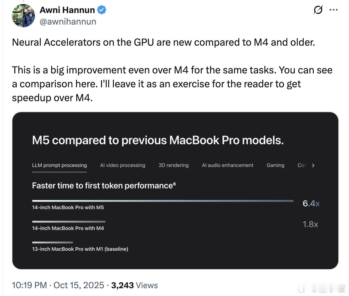 至于M5到底强在哪?有果粉说:AI性能确实更猛。可当被问到“那和M4 Max比呢?”……空气突然安静了。