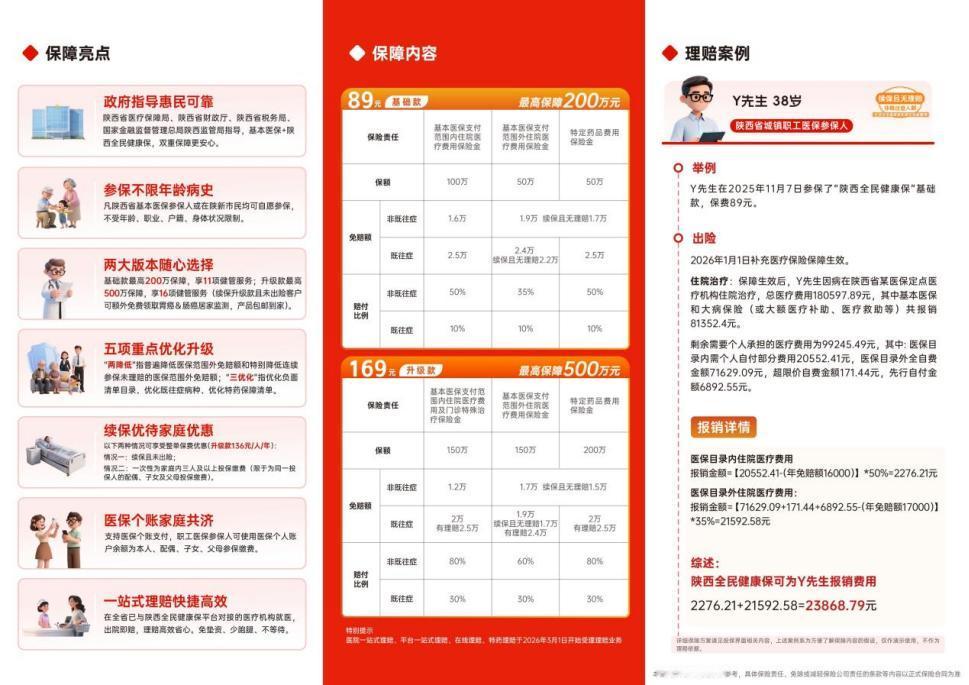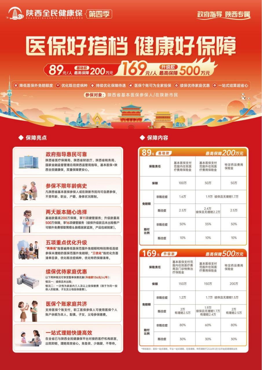 好消息来啦!2026年度“陕西全民健康保”第四季温暖回归!作为陕西省内唯一由政府指导的补充医疗保险,它可是咱们老百姓的健康“守护神”哦! 这次升级,真是诚意满满!不限年龄病史,不管你是小宝贝还是老长辈,都能参保,实现保障人群广覆盖。而且,还有基础款和升级款两大方案可选,基础款89元保200万,升级款169元保500万,还附带超多健康管理服务,简直不要太划算! 值得一提的是,这次还聚焦“两降低、三优化”,医保范围外免赔额降低了,理赔更顺畅。还有续保优待和家庭优惠,特别是连续参保没理赔的乡党,医保外的免赔额降得更多,实实在在帮大家减轻负担,鼓励大家持续参保,家庭共担,一起守护健康。 另外,职工医保的朋友们还有福了,可以直接用医保个账余额给家人参保缴费,实现家庭共济。而且,在全省与“陕西全民健康保”平台对接的医疗机构就医,还能实现“出院即赔”,高效又省心。 10月15日起,大家就能通过“陕西全民健康保”微信公众号、支付宝等渠道参保啦,保障能管一整年,有需要的乡党们赶紧给自己和家人安排上,不要错过!