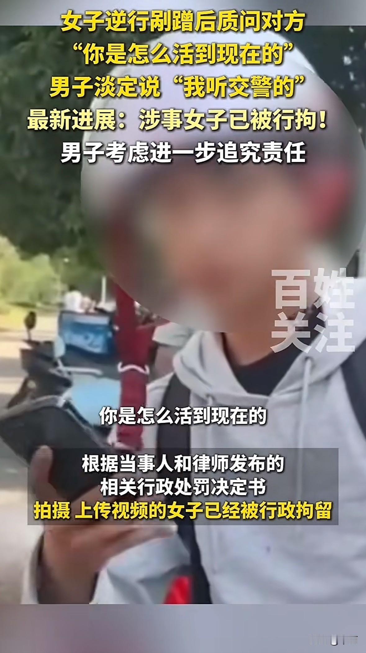 江苏苏州,小伙骑车被逆行女子剐蹭。女子举手机拍摄,质问小伙“你是怎么活到现在的”,态度嚣张。小伙全程冷静,只重复“我听交警的”。 交警判定女子全责。她表面同意去交警队,中途却溜走。还把剪辑过的视频发上网,没给小伙面部和电话打码,导致其隐私泄露遭网暴。 10月11日,女子因违反《治安管理处罚法》被行政拘留。小伙正考虑起诉,追究她侵犯名誉权、肖像权的责任。 这事儿挺明白,逆行违法在先,网暴更是错上加错。不是谁闹得凶谁有理,法律只看事实。小伙的冷静应对堪称典范,遇事找法律才是最靠谱的办法。网络从来不是法外之地,耍横撒泼终究要付出代价。
