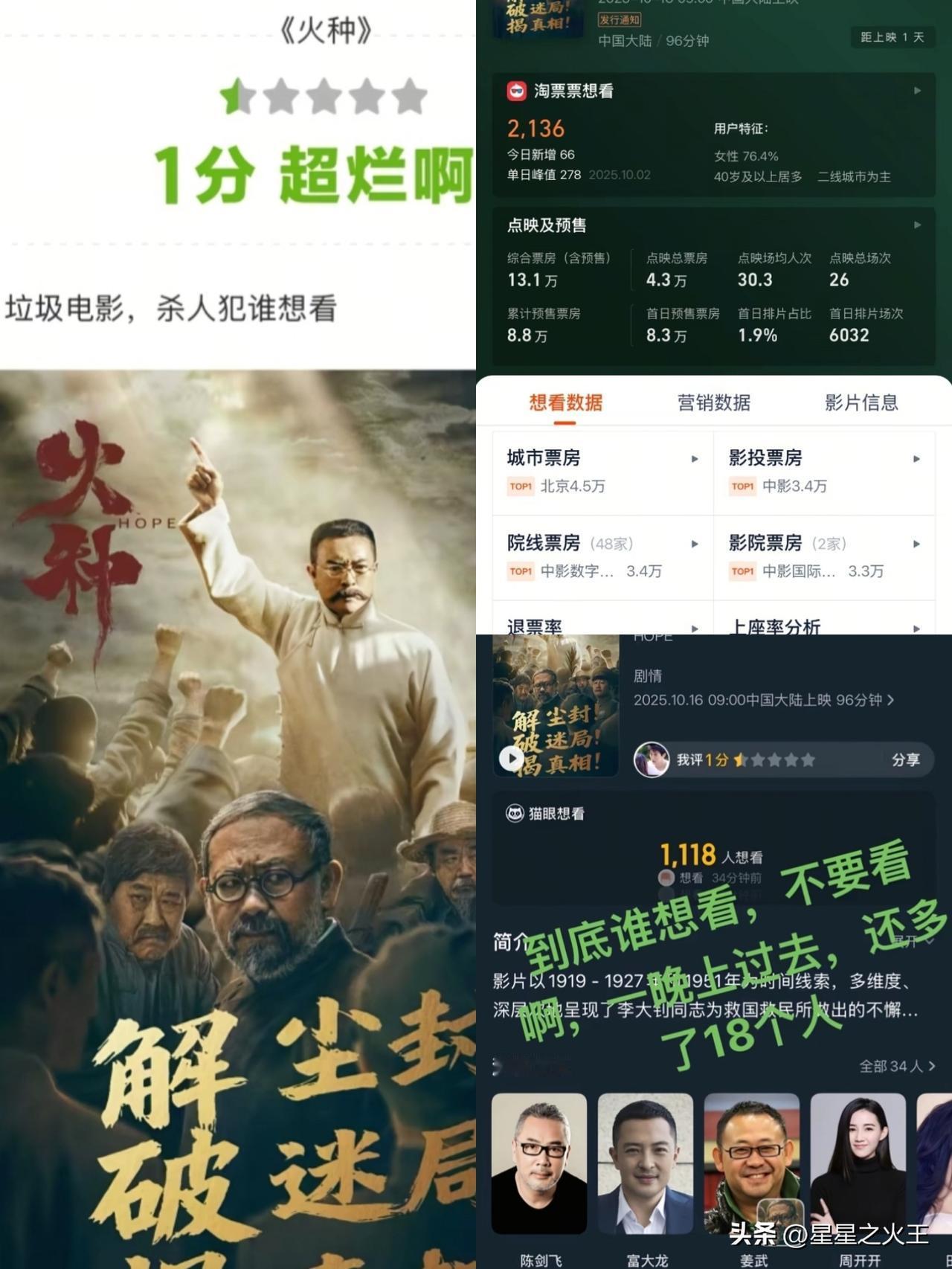 《火种》预售惨淡 既使有了富大龙姜武的明星也没人愿意去看。重庆多家热门影院预售