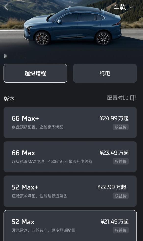 车若初见[超话] 智己LS6做了一次灵活调整,新增超级增程52Max+版本,限时权益价22.99万,也就是52度电,把舒适性配置拉满的状态,纯电续航370km,对比66度电的450km,短途周充也能实现,之前52度电没有大满配,用户不得已选择66度版本,现在不用妥协这些了,4个版本的价差给大家翻出来列好了,买之前研究好哪个才是最适合您的。