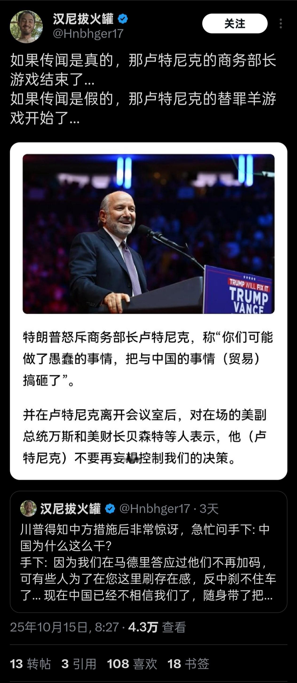 最近美国对于东大的稀土反击无人狂怒,贝森特、格里尔、万斯都出来发话了,但是你听不见中美贸易战的主角之一--美国商务部长卢特尼克的话 [偷笑]