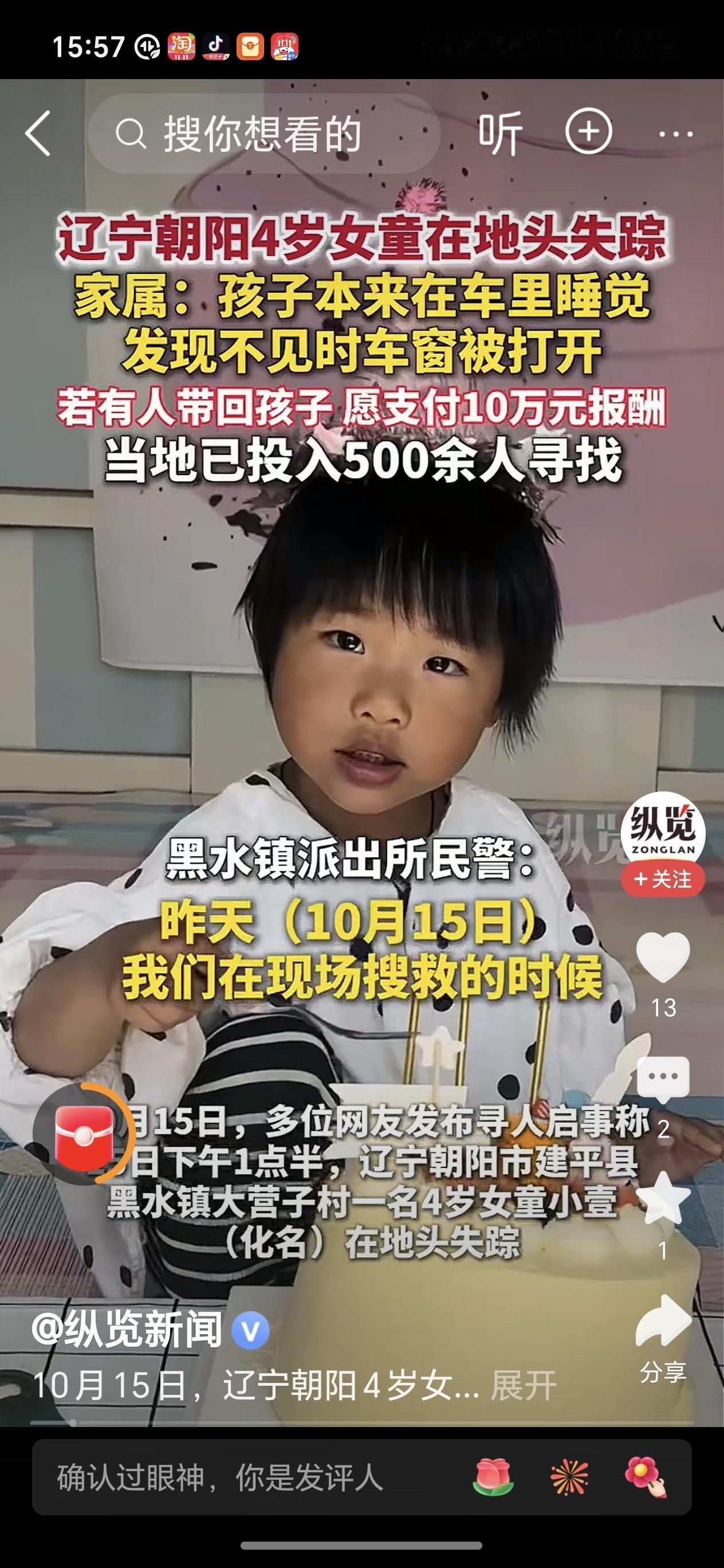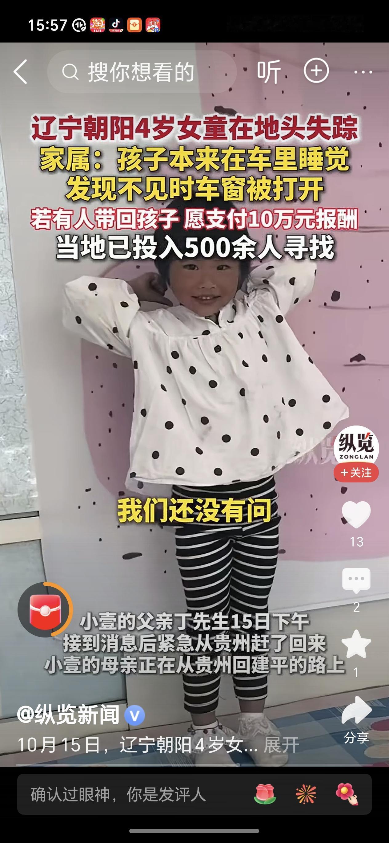 4岁孙女车内睡着失踪10月15日在辽宁,爷爷奶奶带着4岁孙女开面包车到自家地里秋收,因孙女睡着了,两位老人将孩子放车内就去干活了,20分钟后奶奶发现孙女不见了,车门锁着但车窗却开着,孩子是被人抱走还是自己走失还不得而知,当地出动了无人机、搜救犬等多种救援力量,将走失地点2公里范围内进行了仔细寻找,却没有发现任何线索,目前还在进一步扩大寻找范围。 至今已过去20多个小时,孩子还没找到,令人太揪心了! 祈祷小女孩平安,早日与家人团聚!