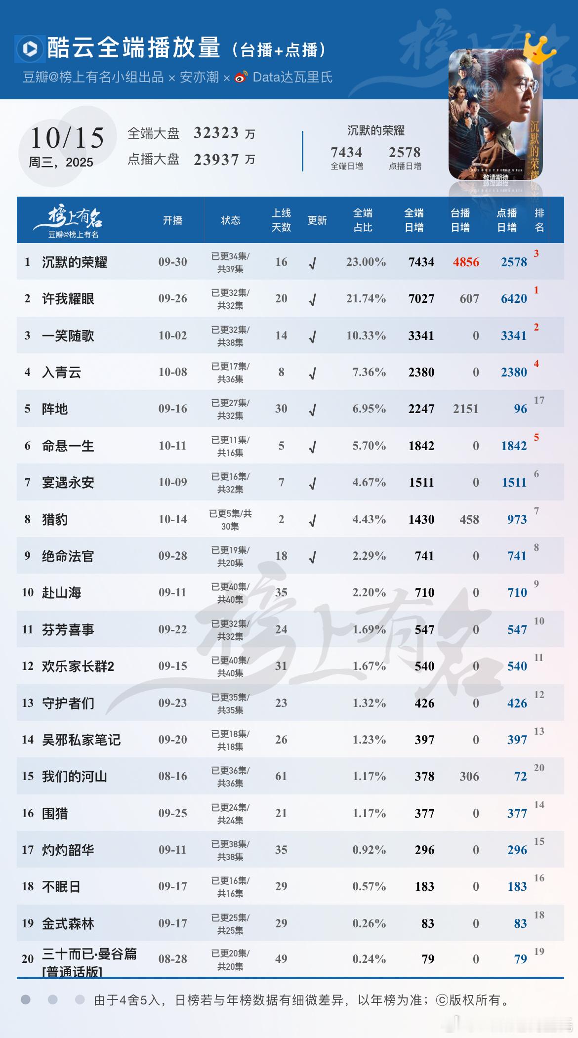 电视剧沉默的荣耀 全端日冠7434,点播端2578涨幅180万