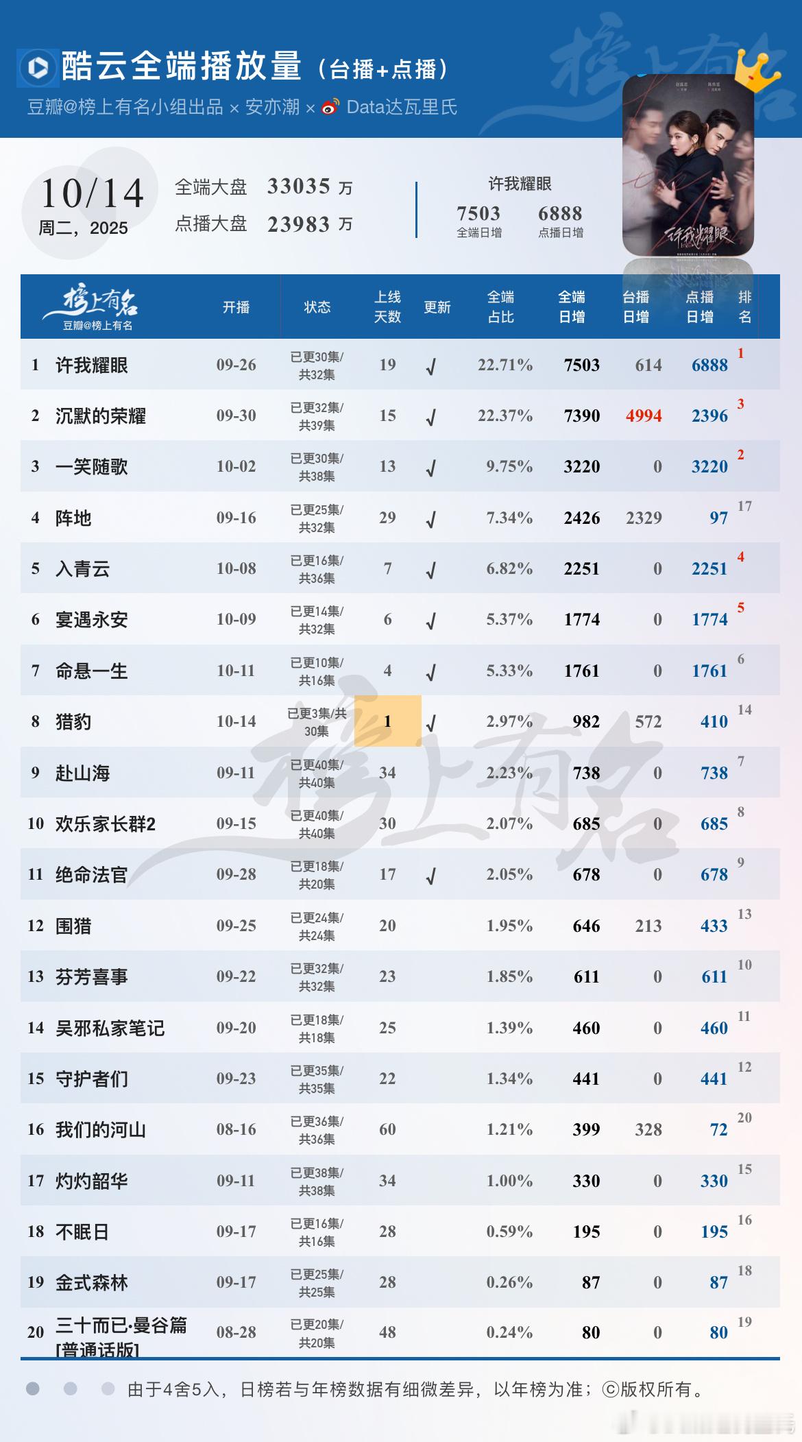 许我耀眼 全端7027,点播端6420降幅460