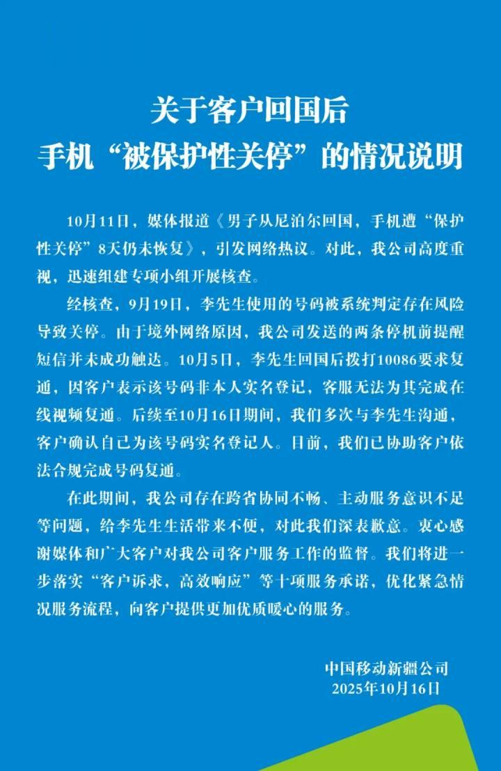中国移动新疆公司今天发布《关于客户回国后手机“被保护性关停”的情况说明》: