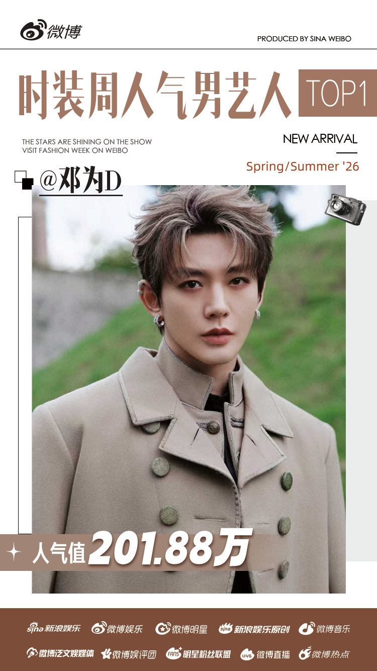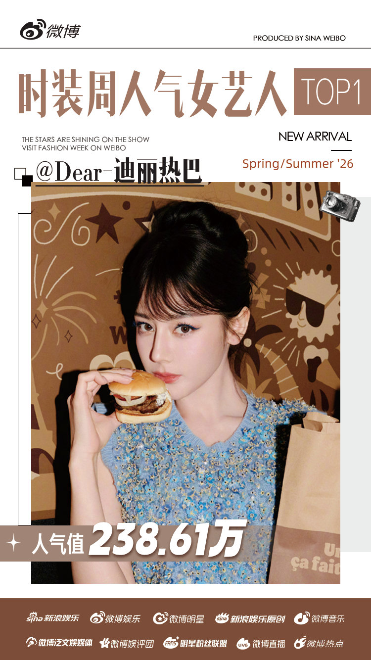 迪丽热巴时装周人气女艺人TOP邓为时装周人气男艺人TOP时装周人气认证送达!恭
