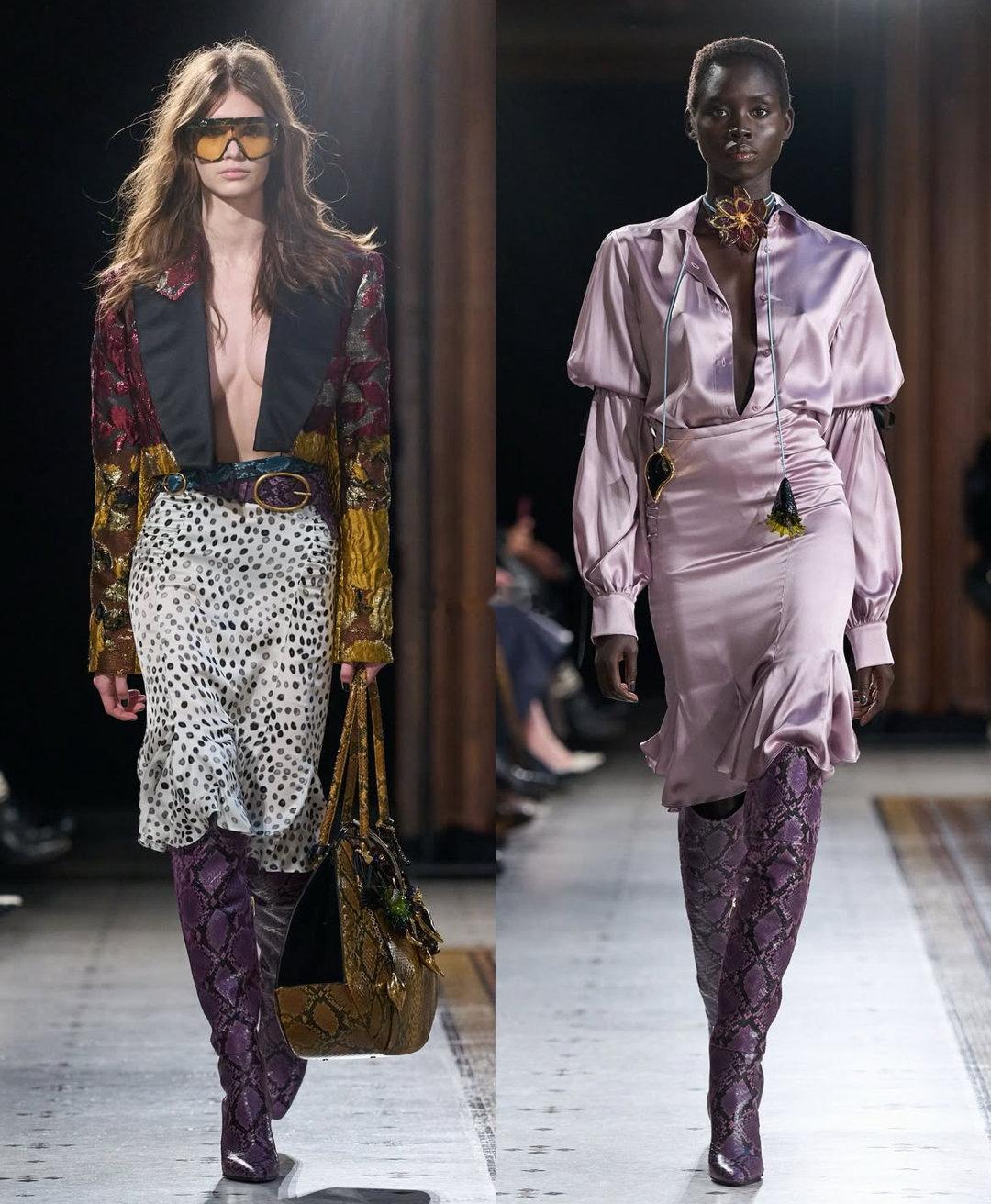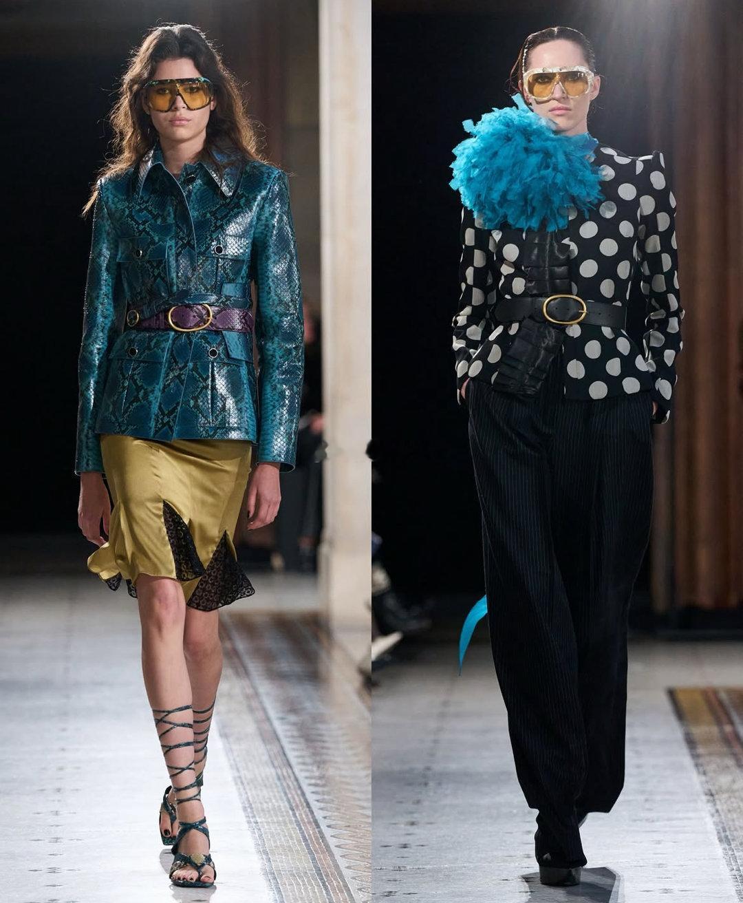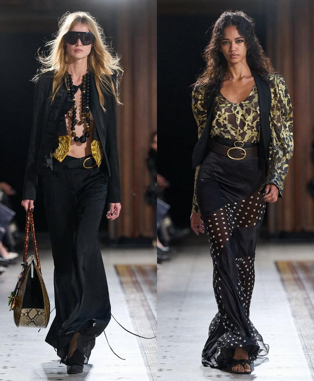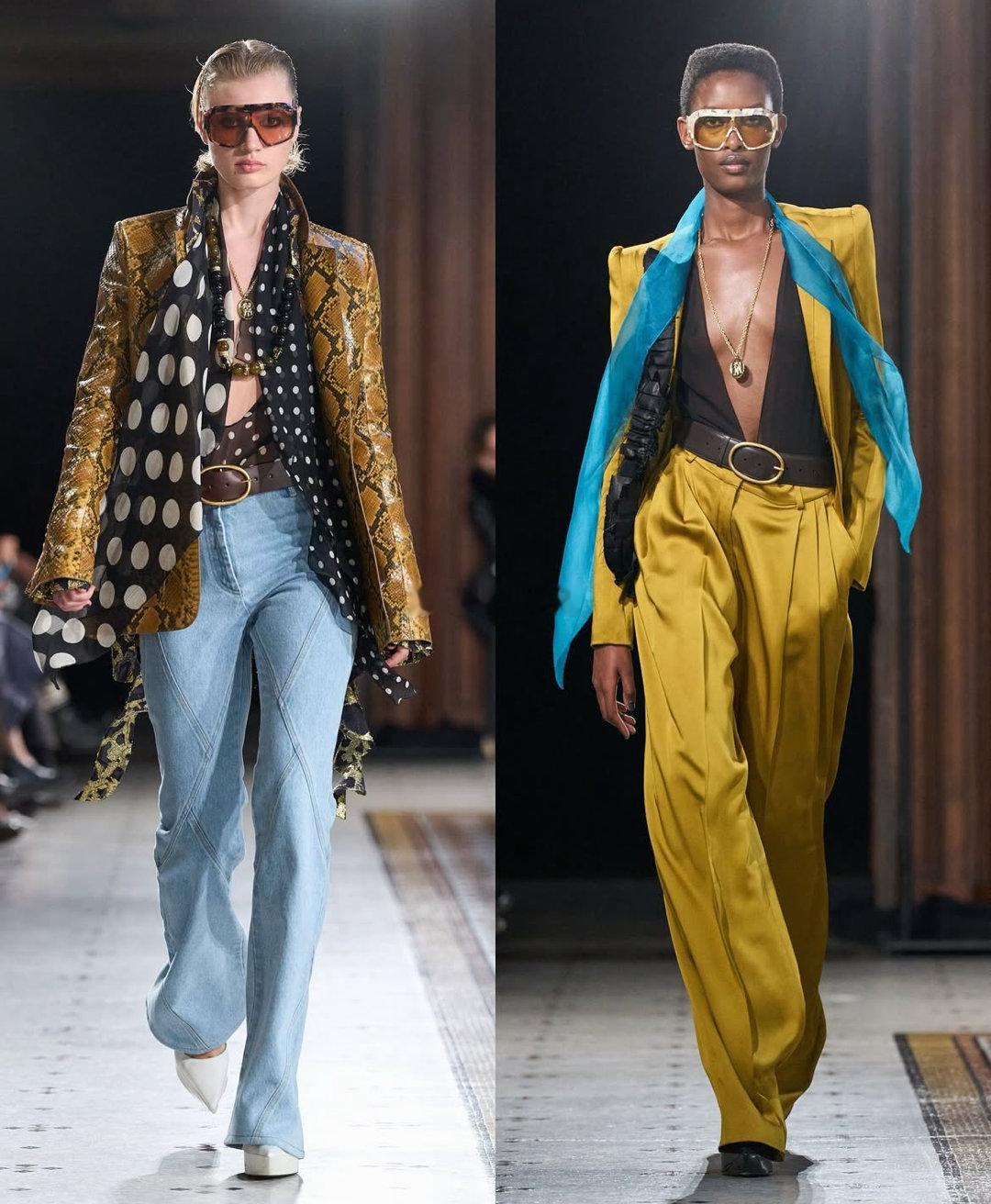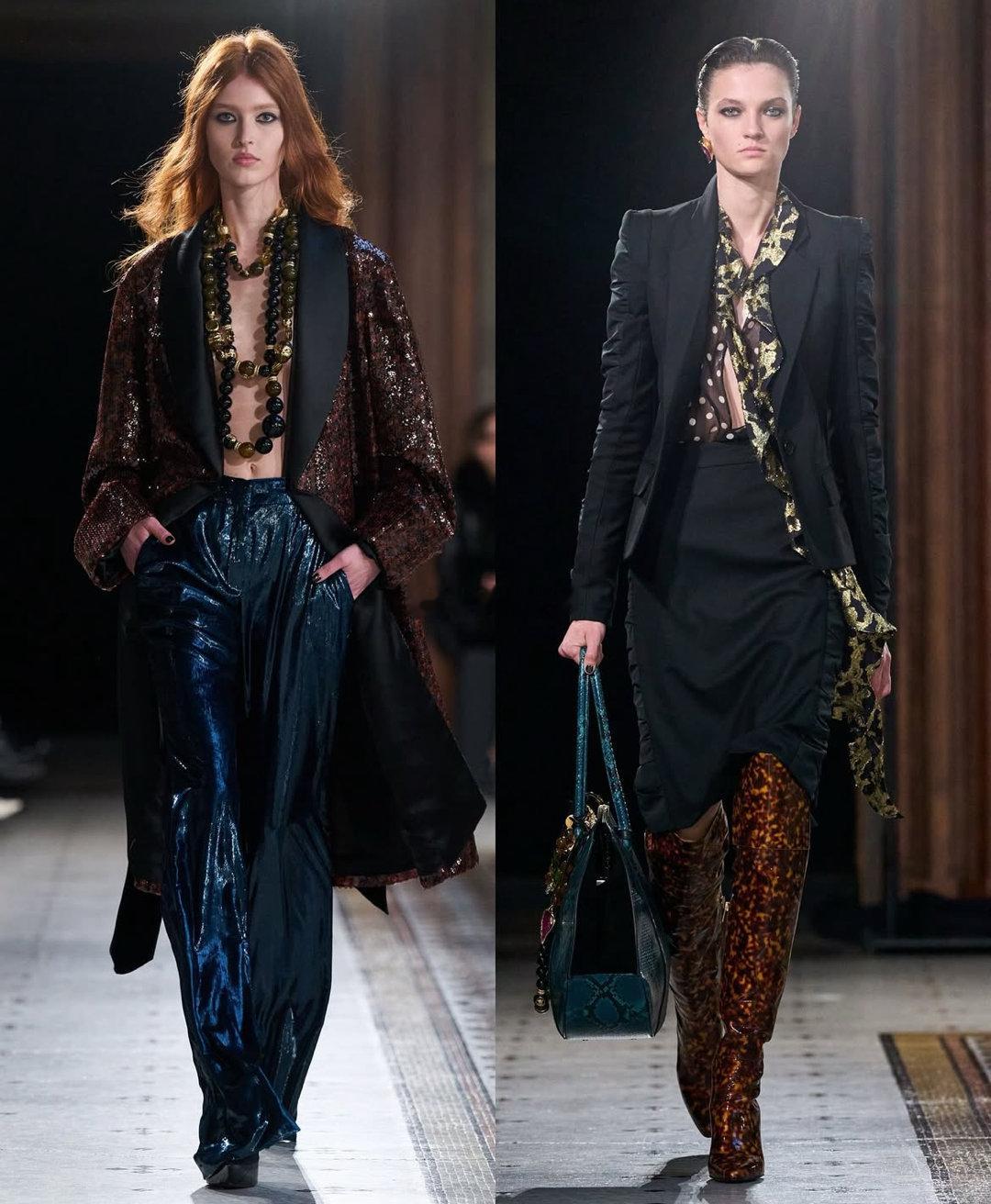 🔹 廓形:深V领连衣裙与修身西装,勾勒出兼具力量与柔美的中性轮廓。