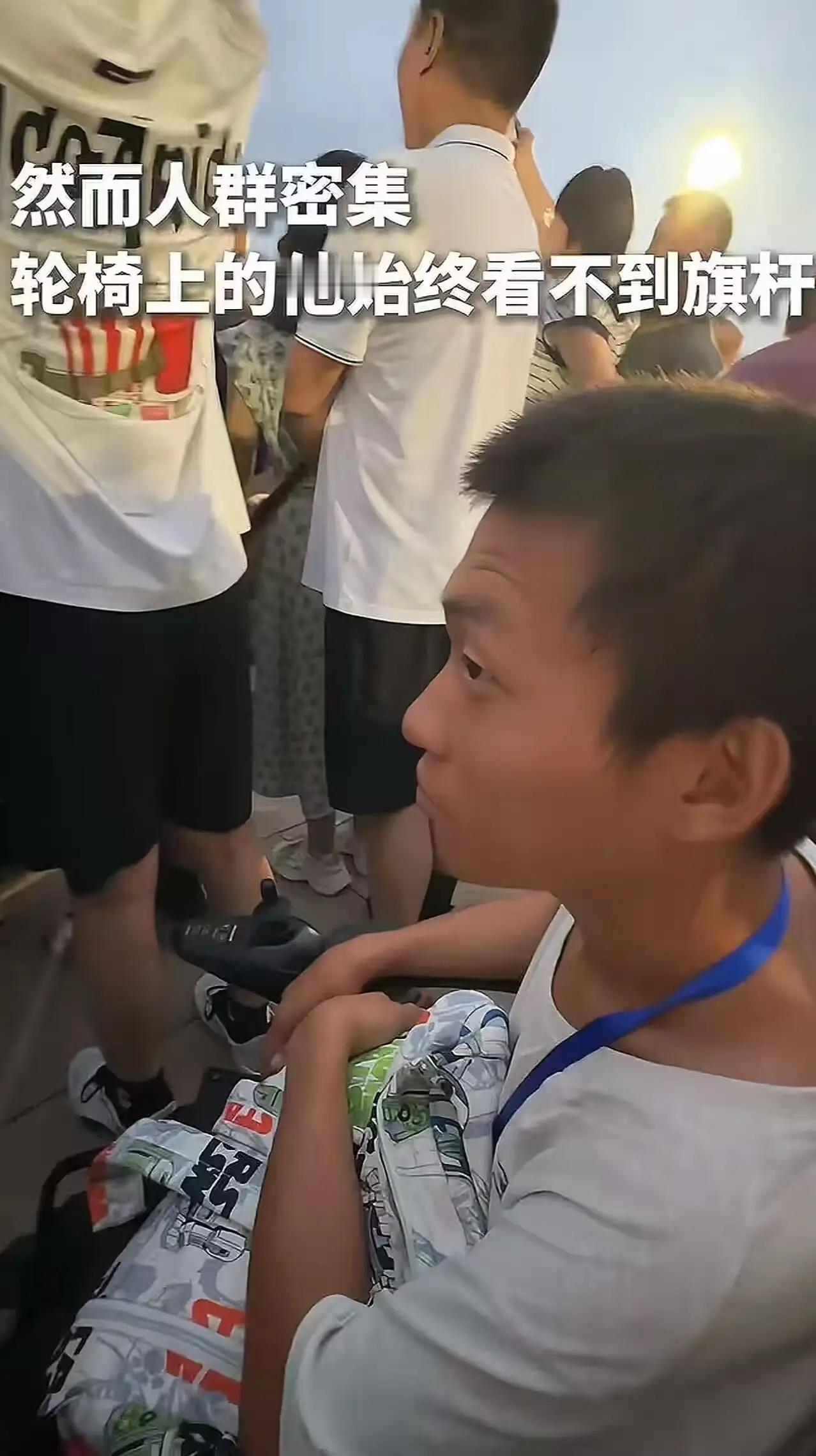 看哭了!脑瘫男孩坐着轮椅去天安门看升旗,可是前面一群密密麻麻的人挡住了他的视线,他坐着什么也看不到!就在他一脸失望、眼神黯然的时候,身旁一个年轻的小伙子突然站了出来,他的声音不高,却字字铿锵:“大家能不能帮帮他?让他也看看升旗的那一刻,这是他一生中最宝贵的时刻。”话音未落,周围的人开始纷纷响应。 有人伸出手臂,有人用力推开前方的人群,渐渐地,一双双温暖的手把这个男孩从轮椅中抬起,轻轻地放在了空中。那一瞬间,天安门广场的喧嚣似乎都静止了,只剩下那份纯粹的善意与温暖。 男孩的眼睛瞬间亮了起来,他终于看到了那飘扬的五星红旗,听到了庄严的国歌,感受到了那份从未有过的荣耀与感动。那一刻,不仅仅是他一个人的奇迹,更是所有人的善良在瞬间汇聚成的光辉。 这件事在网络上传开后,引发了热烈的讨论。有人说:“我们常常在繁忙中忽略了身边的特殊群体,但只要多一份关心,就能让他们的世界变得不一样。”有人感慨:“善意其实很简单,就是在别人需要的时候伸出援手。”更有人反思:“我们是否也应该用心去关注那些被忽视的角落,让每一个人都能感受到社会的温暖?” 其实,这样的故事背后,折射出的是我们这个时代最需要的正能量——那份善良、那份包容、那份不计较的付出。每个人都可以成为那个“动员者”,用一点点行动,点亮别人的人生,也照亮自己的人生。 或许,生活中我们都在追逐梦想,追求成功,但真正让人感动的,往往不是那些华丽的成就,而是那些在关键时刻,愿意为他人停下脚步的善意。就像那天在天安门广场,陌生人用行动告诉我们:只要心中有爱,世界就会变得更加温暖。 所以,亲爱的读者,你是否也曾在某个瞬间被陌生人的善举打动?你是否也愿意成为那个在他人需要时伸出援手的人?让我们用行动传递温暖,用心点亮世界。因为,善良从来都不是一种稀有的品质,而是我们每个人都可以拥有的力量。脑瘫小男孩 轮椅男孩儿