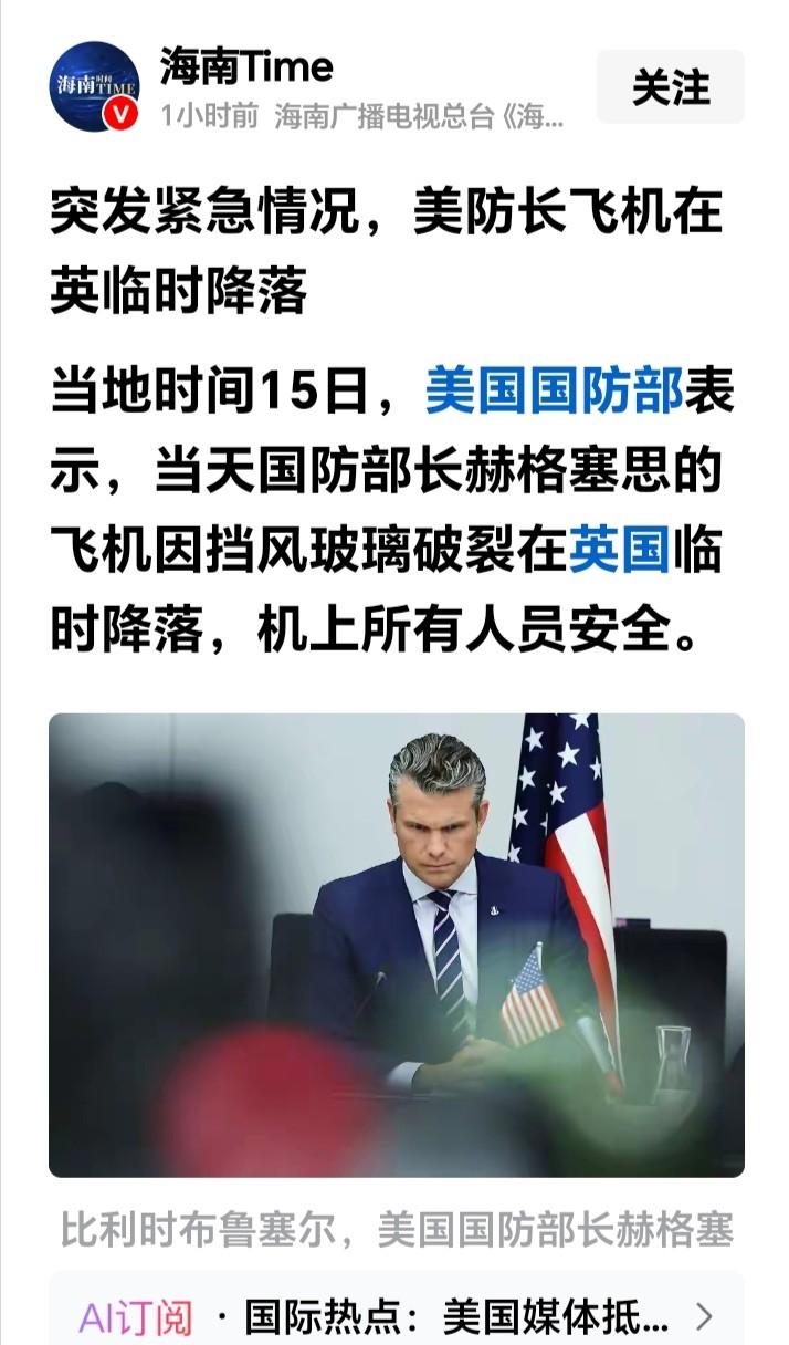 是什么人,为美国国防部长,安排了一架有事故隐患的专机呢?根据最新消息,可以看得出事情发生的很突然,当地时间15日,美国国防部长赫格塞思乘坐的专机突发挡风玻璃碎裂,不得不临时迫降英国! 要知道,他坐的,可是美国空军专门维护的顶级专机,不过,在当时出问题时,这飞机上挂的,竟然是“7700”紧急代码。 说句实在话,这个代码,一般是飞机发动机故障、舱内失压才用得上,结果,防长专机,只因为一块挡风玻璃裂痕,就闹出这么大动静。 不过,这也不是第一次了,今年2月,美国国务卿鲁比奥的专机,也是因为驾驶舱玻璃裂纹,被迫返航,难道美国军工,现在连块玻璃都造不踏实了? 更值得琢磨的是,赫格塞思这人,可不是善茬,他上任后,大力推行军队改革,砍了不少传统项目,空军内部,对他不满的人,一抓一把。 (每天更新,点进主页我们一起看世界!喜欢文章的可以帮忙点个关注点个赞~) 但要说有人敢在专机上动手脚,那倒不至于,大家怎么看?