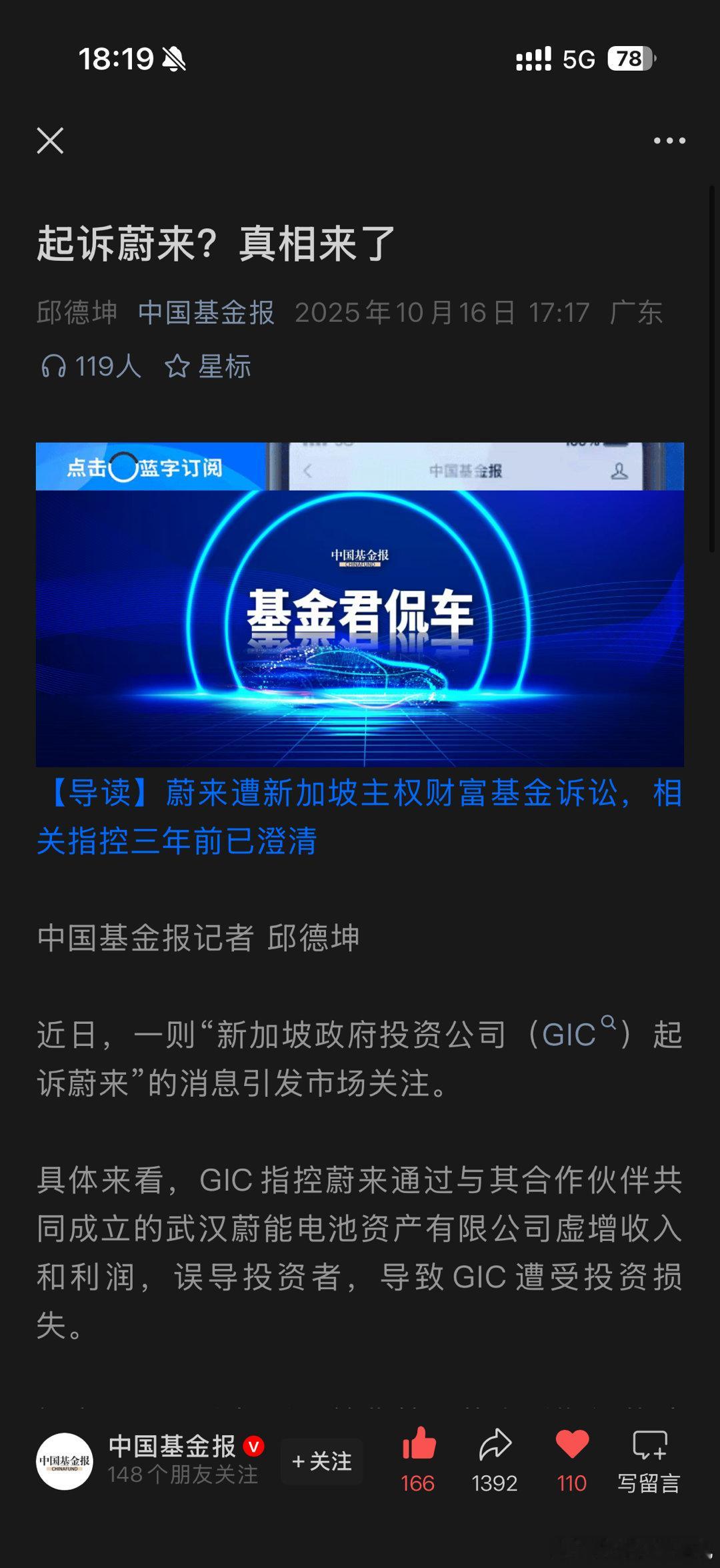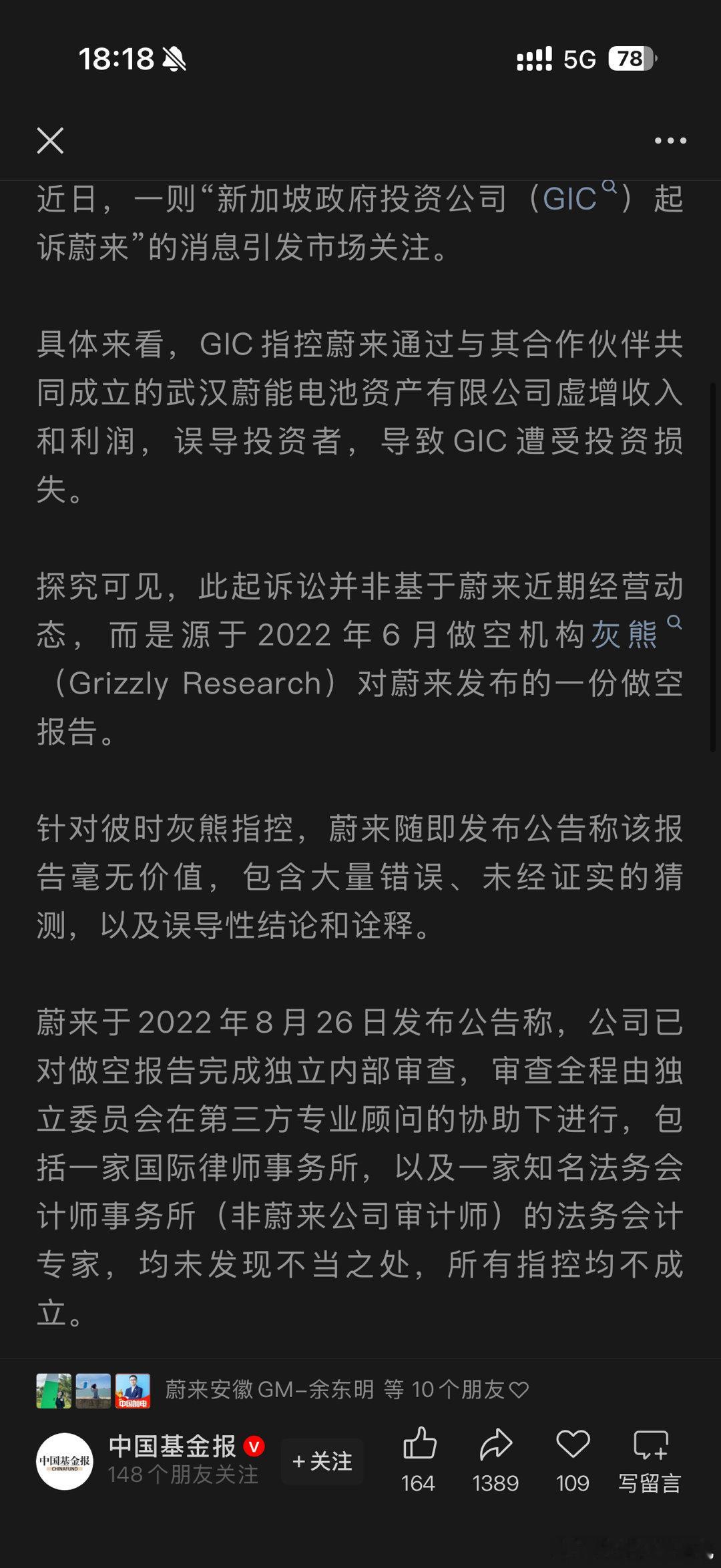 新加坡主权基金最近起诉蔚来…完整的描述这次GIC起诉居然是根据22年灰熊