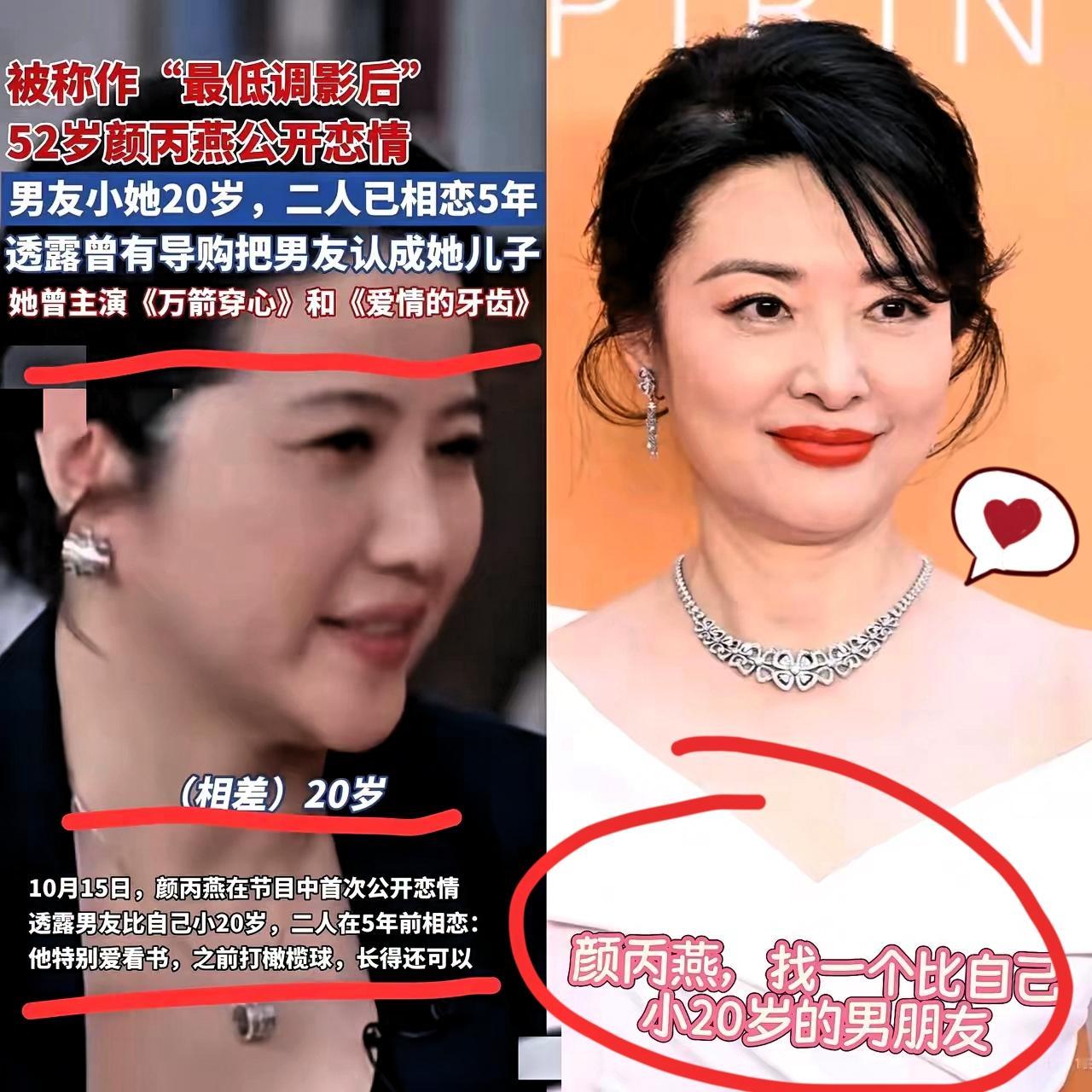 你可以喷张纪中老牛吃嫩草 你也可以喷郭富城找了小20岁的方媛 但唯一不能喷的就是 54岁的颜丙燕和小20岁男友在一起,却满屏都是支持的声音,这差别也太明显了! 她哪是靠名气钓小鲜肉啊?为了照顾病重妈妈,直接推掉大热剧本息影8年,连房子都卖了,这份孝心就够让人佩服。 复出后凭《万箭穿心》拿遍影后,却从不接广告,一门心思钻演技,根本没多少流量和钱可图。 她那小男友也不是图啥,北电导演系出身,会打球还爱读书,家境本身就不错。之前被店员认成母子,男生直接说去哪都要牵手,这份坚定比啥甜言蜜语都实在。 说到底,大家支持的不是“姐弟恋”,而是颜丙燕靠实力和人品活成了底气,连李静都羡慕她“吃上细糠”。 你们说,要是换成别人,还能有这样的口碑吗?