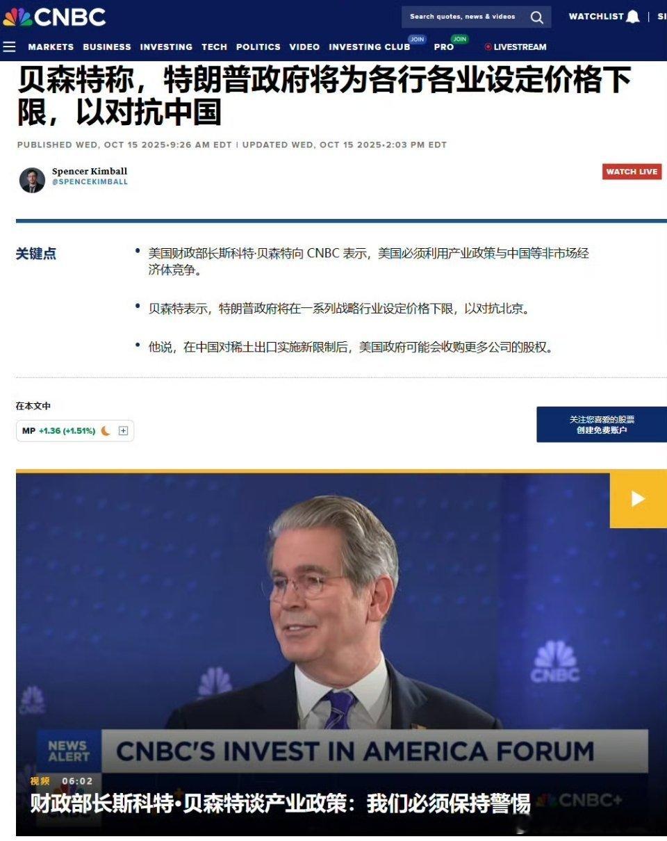 美财长不装了🔻美财长这次真的不装了,贝森特表示,美国将为各行各业设定价格下限。而且为了应对稀土管制,美国还要收购更多公司的股权?意思是美国要大规模国企化?[哆啦A梦吃惊][哆啦A梦吃惊]