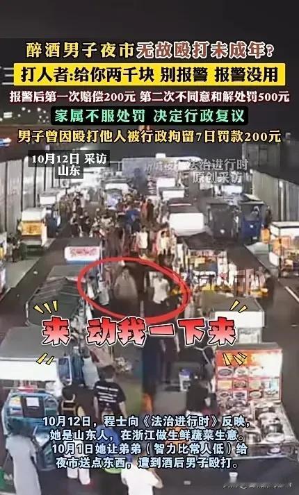“严查到底!”10月1日,一外地女子在浙江做生意,晚上让智力低下的弟弟去夜市送货,结果被醉酒男故意找麻烦,不仅多次殴打小伙,还扬言报警也没用!报警后,警方做出罚款500元、不拘留的处罚,女子听后坚决不同意。 这名女子姓程,山东人,在浙江做生鲜蔬菜生意多年,撑起了家里的生计。弟弟比她小几岁,先天智力发育比常人迟缓,说话做事都慢半拍,却总想着帮姐姐分担。 那天夜市订单催得急,程女士手头实在脱不开身,弟弟主动提出去送货,临走前还反复念叨“姐放心,我能行”。谁也没料到,这趟普通的送货,会让他遭遇无端的暴力。 醉酒男是夜市里的食客,喝得满脸通红,看到拎着货物的弟弟动作迟缓,莫名动了怒。先是在夜市门口故意撞了弟弟一下,见弟弟没反应,抬腿就踹了一脚。弟弟吓得愣在原地,他又追上去,在监控死角里扇了弟弟的脸。 周围摊贩想上前阻拦,被他恶狠狠地吼了回去。第三次冲突更过分,他直接把瘦弱的弟弟拎起来转了一圈,重重摔在地上。保安赶来护着弟弟,也挨了他一个耳光。 “报警也没用!” 路人提醒弟弟报警时,醉酒男梗着脖子叫嚣,语气里全是轻蔑。弟弟吓得手抖,还是在路人帮助下拨通了报警电话。民警到场后将人带走,没过多久就让醉酒男扫了200块钱给弟弟,说是和解赔偿。 程女士接到弟弟带着哭腔的电话赶过来,看到弟弟脸上的红印和发抖的身子,当场拒绝了这份“和解”。 重新立案调查后,给出的结果却是罚款500元,不予拘留。这话听得程女士浑身发颤,她抓住民警反复追问:“他三次动手打人,还威胁报警没用,就只罚500? 我弟是智力低下,他连躲都不会躲啊!”民警只说按规定处理,没再多解释。程女士当天就明确表示,要申请行政复议,绝不接受这样的处理结果。 法律早有明确,醉酒的人违反治安管理,应当给予处罚,不能以醉酒为借口免责。 更关键的是,弟弟属于智力障碍者,法律对这类弱势群体有特殊保护——殴打残疾人,即便未造成轻微伤,也可能被行政拘留。醉酒男的行为不是简单的推搡,而是三次主动攻击,还在公共场所闹事,甚至威胁“报警没用”,主观恶意已经很明显。 更让人无法接受的是,这名醉酒男并非初犯,此前就因殴打他人被行政拘留7日、罚款200元。 有前科还敢如此嚣张,这次处罚却比上次更轻,连拘留都免了,这样的处理很难让人信服。程女士想不通,弟弟的特殊身份不该成为被欺负的理由,更该是法律重点保护的依据,可这份处罚里,丝毫没体现出对弱势群体的倾斜。 消息传开后,不少人都替程女士姐弟抱不平。有人说,要是被打的是普通人,处罚都不该这么轻,何况是毫无反抗能力的智力障碍者。 也有人提到,之前陕西有醉酒交警殴打智力残疾服务员,最终被判了两年六个月有期徒刑,同样是殴打智力障碍者,差距怎么这么大。大家争议的核心很简单:执法该讲尺度,更该讲温度,对弱势群体的保护不能只停留在纸面上。 程女士已经在整理材料,准备行政复议。她要的不是多高的赔偿,是一个公道,是让弟弟知道,被欺负了真的能找到说理的地方,那些扬言“报警没用”的人,终究要为自己的行为付出代价。 法律的尊严,不仅在于惩罚犯罪,更在于守护每一个弱者的安全。当弱势群体遭遇暴力时,执法的天平更该偏向正义的一方,这才是“严查到底”该有的样子。 各位读者你们怎么看?欢迎在评论区讨论。