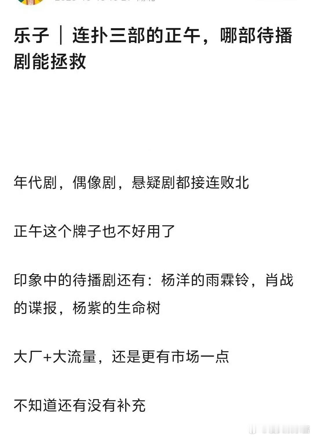 杨洋《雨霖铃》、肖战《谍报》、杨紫《生命树》哪部能拯救正午目前的情况