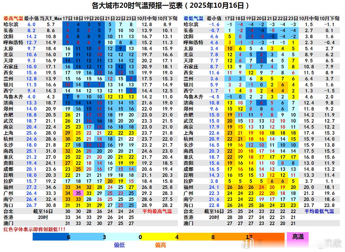 未来最高气温可能比常年同期偏低10℃以上的有:17日哈尔滨1℃,19日长春3℃,银川20日7℃,郑州20日11℃,长沙20日12℃。从最低气温预报看,31个省会首府直辖市,只有3个未来不会创新低,一个是乌鲁木齐,冷空气已经影响创过新低了;一个是拉萨,因为高原,冷空气上不去;一个是海口,因为太南,距离远,冷空气长途跋涉减弱。