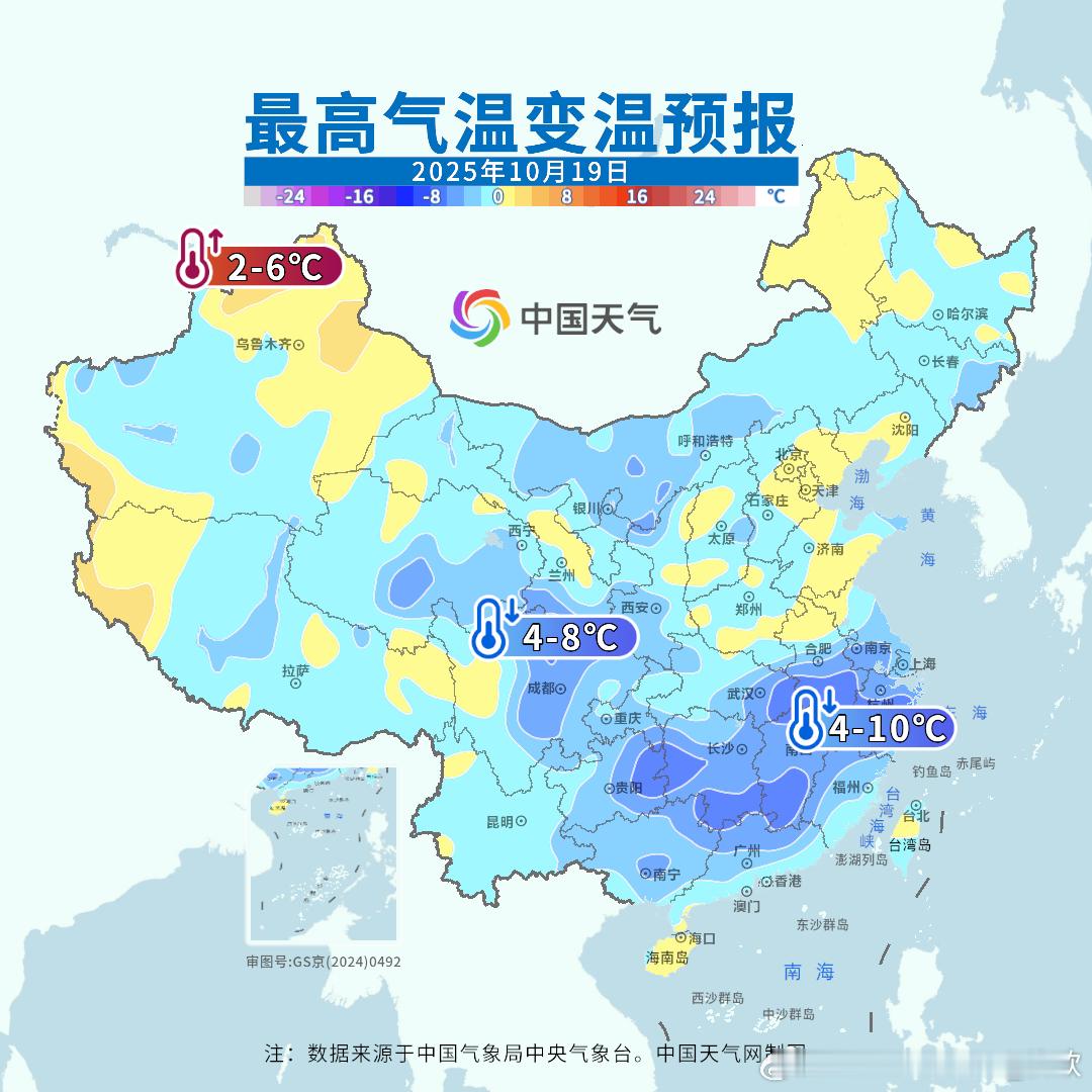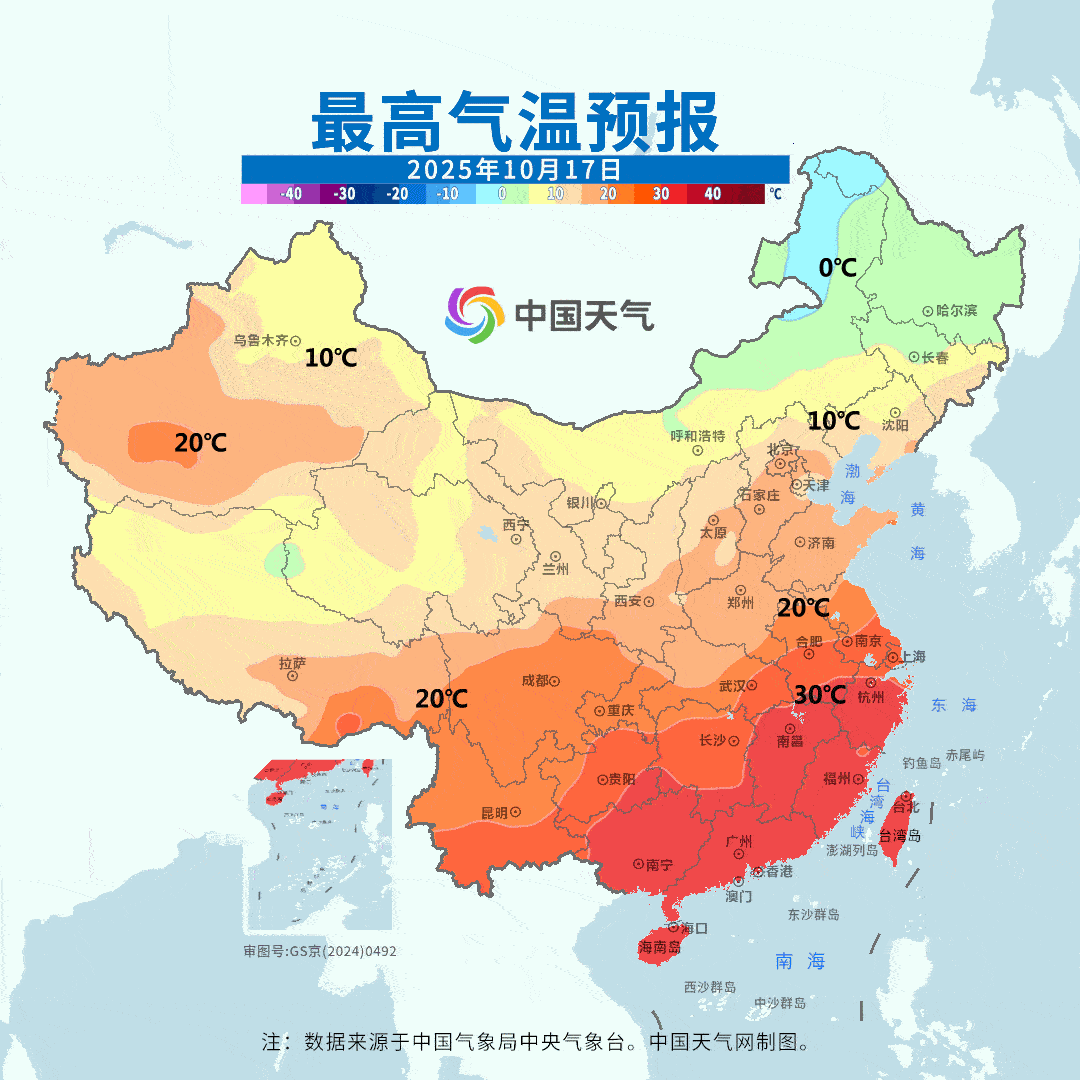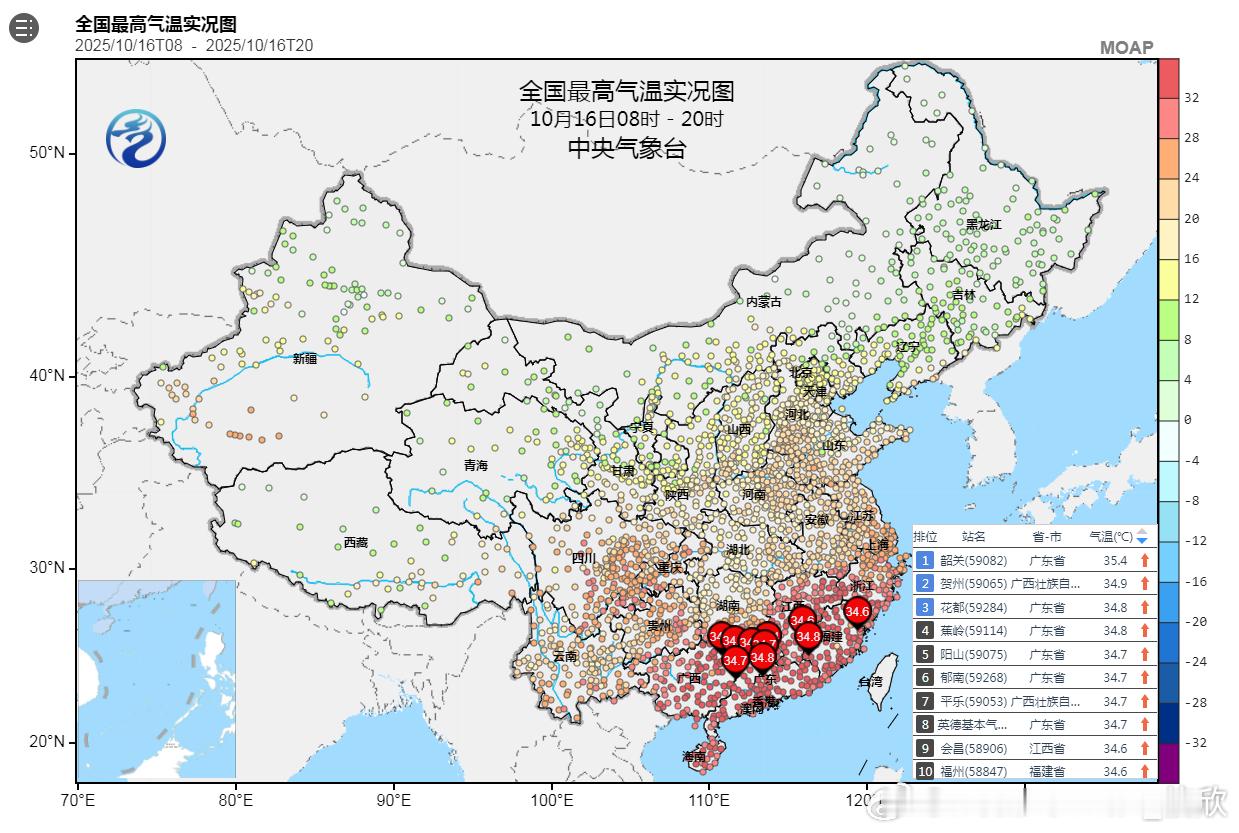 【气温】今天广东韶关35.4℃,只有这一个站点出现高温。今天广西雁山34.4℃,只有这一个站点打破10月中旬最高气温纪录。明天南方在冷空气到来前,气温可能还有个小回升。但之后冷空气会使得南方告别暑热。而且因为冷空气源源不断补充,未来我国大部地区气温偏低时间长,偏低幅度大,部分城市提前感受11月的冷。