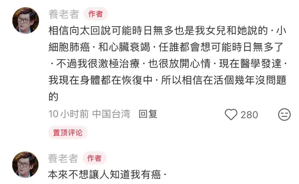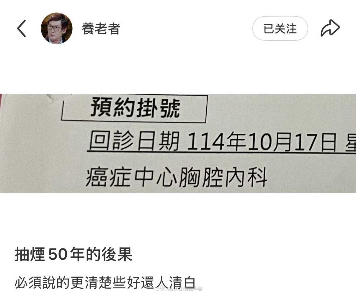 今天10月16日郭碧婷父亲在社媒发文:“抽烟50年的后果,必须说的更清楚些好还人清白。” 随即他还晒出了一张预约挂号截图,图中写有“癌症中心胸腔内科”字样。并在评论区补充说:“本来不想让人知道我有癌。相信向太会说可能时日无多也是我女儿和她说的。小细胞肺癌和心脏衰竭,任谁都会想可能时日无多了。不过我很激极治疗,也很放开心情。现在医学发达,我现在身体都在恢复中,所以相信再活个几年没问题的。” 从图片可以看出郭碧婷老爸年轻的时候是个大帅哥!而且郭爸性格特别可爱,也很爱自己的女儿,一直都很尊重女儿的选择,希望郭爸这次能够早日战胜病魔,尽快恢复健康郭碧婷 郭碧婷爸爸 抗癌日记