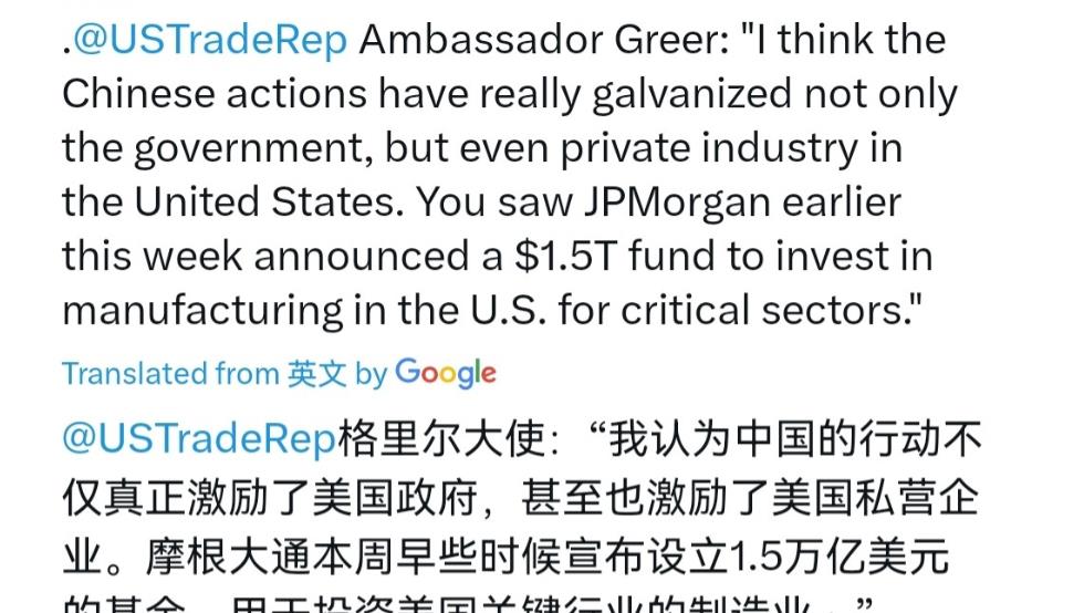 我认为中国的行动不仅真正激励了美国政府,甚至也激励了美国私营企业。摩根大通本周早些时候宣布设立1.5万亿美元的基金,用于投资美国关键行业的制造业。很显然,眼看我们的管制政策没有丝毫松动,也不为美国的威胁所动,美国方面是持续不断的把矛头对着我们。