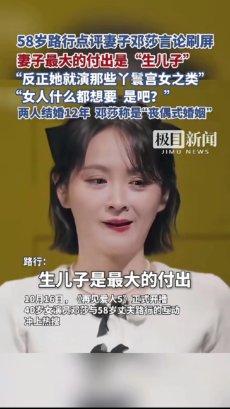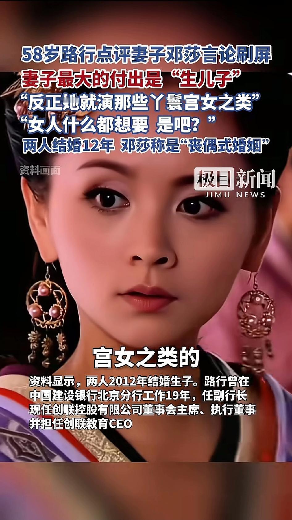 有钱人眼中女人价值就是这样的!路行,58岁,曾任中国建设银行北京分行副行长,现任创联控股有限公司董事会主席、执行董事,同时担任创联教育CEO。路行的妻子是邓莎,40岁,中国内地女演员,出演中国电视剧,小有名气。2012年,因为怀孕,两人结婚。 邓莎评价路行,两人结婚12年,她过的是丧偶式婚姻。路行评价邓莎对家庭最大的贡献是“生了一个儿子”,更是不好奇邓莎的工作内容,“反正就是演一些宫女、丫鬟”。 由此看来,在拥有财富和地位的路行眼里,娶了一个漂亮的女演员是实力的证明,结婚的最大作用是“生儿子”传宗接代,其他的不重要,包括妻子的工作和生活,因为妻子没有他成功,妻子只是他的依附品,以至于回家只会耽误事业的发展。 那么,为什么邓莎还坚持了12年的丧偶式婚姻呢??而且还在继续。