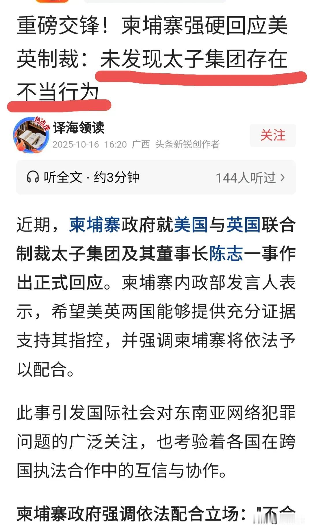 柬政府终于出来站台,以国家名义力撑诈骗集团,令人大开眼界毛骨悚然。政府站台诈骗集团:主权外衣下的罪恶庇护 美英同步制裁柬埔寨太子集团的雷霆行动,揭开了跨国诈骗网络与国家权力交织的惊悚真相。当12.7万枚比特币(估值150亿美元)的赃款被查获,当“不打死就行”的体罚标准曝光,柬埔寨政府的表态却令人脊背发凉。 内政部发言人公开宣称太子集团“完全符合当地法律”,要求美英先提供“足够证据”才肯配合调查。这种看似维护主权的说辞,实则是对罪恶的公然庇护。要知道,该集团旗下10个诈骗园区用贩运劳工实施诈骗,仅两大中心就操控7万多个社交账号诱骗受害者毕生积蓄。 更惊悚的是,主犯陈志身兼首相私人顾问,获封公爵头衔,其国籍获取程序被官方认证“合规”。这印证了“根植精英阶层、受政府严密保护”的传闻并非空穴来风。 当诈骗产业成“灰色GDP支柱”,当高官与犯罪集团形成利益共同体,柬埔寨政府的站台之举,早已超越法治底线,成为跨国犯罪的帮凶。