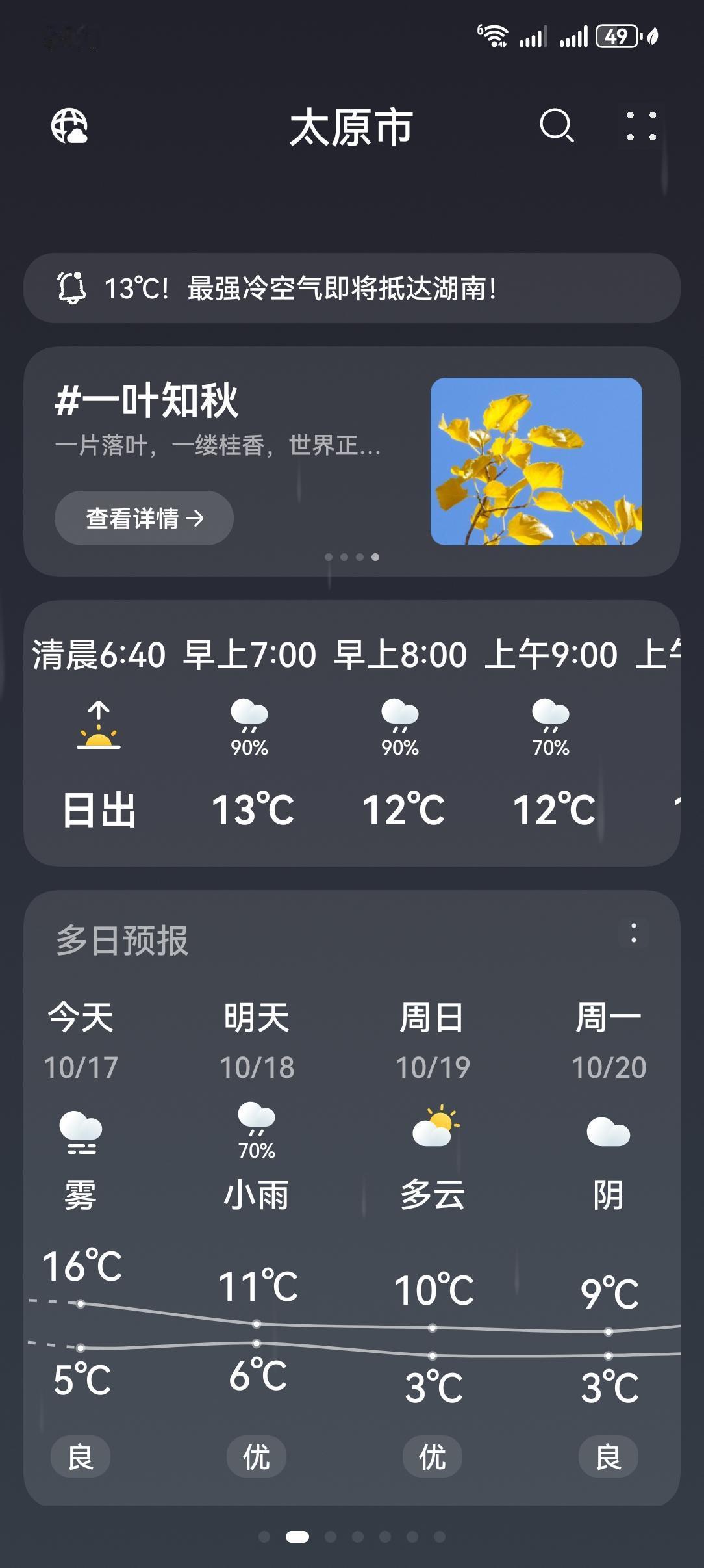 山西太原,阴雨连绵,气温下降,10月19日要提前供暖,大家外出时一定要添衣保暖,
