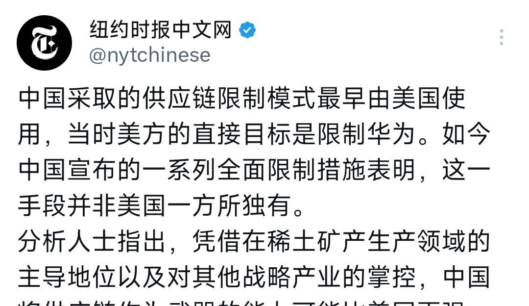 纽约时报中文网昨晚(10月16日晚)评论道:“中国采取的供应链限制模式最早由美国使用,当时美方的直接目标是限制华为。如今中国宣布的一系列全面限制措施表明,这一手段并非美国一方所独有。 分析人士指出,凭借在稀土矿产生产领域的主导地位以及对其他战略产业的掌控,中国将供应链作为武器的能力可能比美国更强。” [机智]评几句:纽约时报能坦陈美国是“长臂管辖”的“原创者”,倒也难得地保有几分媒体人的骨气,未彻底堕落成政客的提线木偶。回望过往,美国以“国家安全”为遮羞布,对华为等中企极尽打压之能事,将供应链化作制裁利刃,玩得那叫一个得心应手。如今中国合理反制,某些美国政客却瞬间戏精附体,哭天抢地扮起受害者,何其荒诞!中国手握稀土等战略王牌,以供应链为盾不过是正当自卫。美国若真有底气,就该坦然接受公平竞争,而非一边使阴招一边卖惨,这般双标嘴脸,早被世界戳穿!