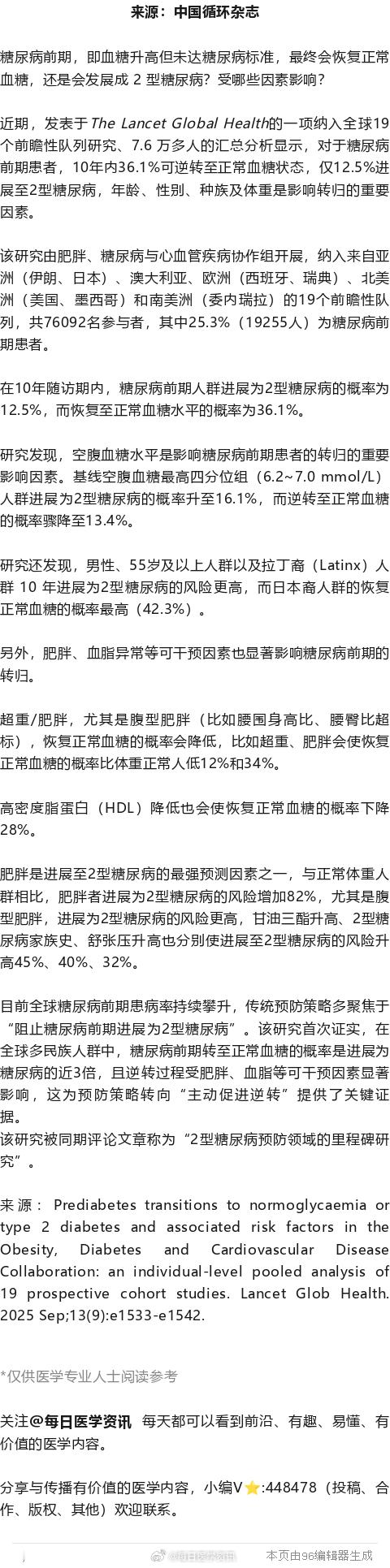 糖尿病前期,10年内超三成可恢复至正常血糖,超重/肥胖影响转归,柳叶刀子刊研究近