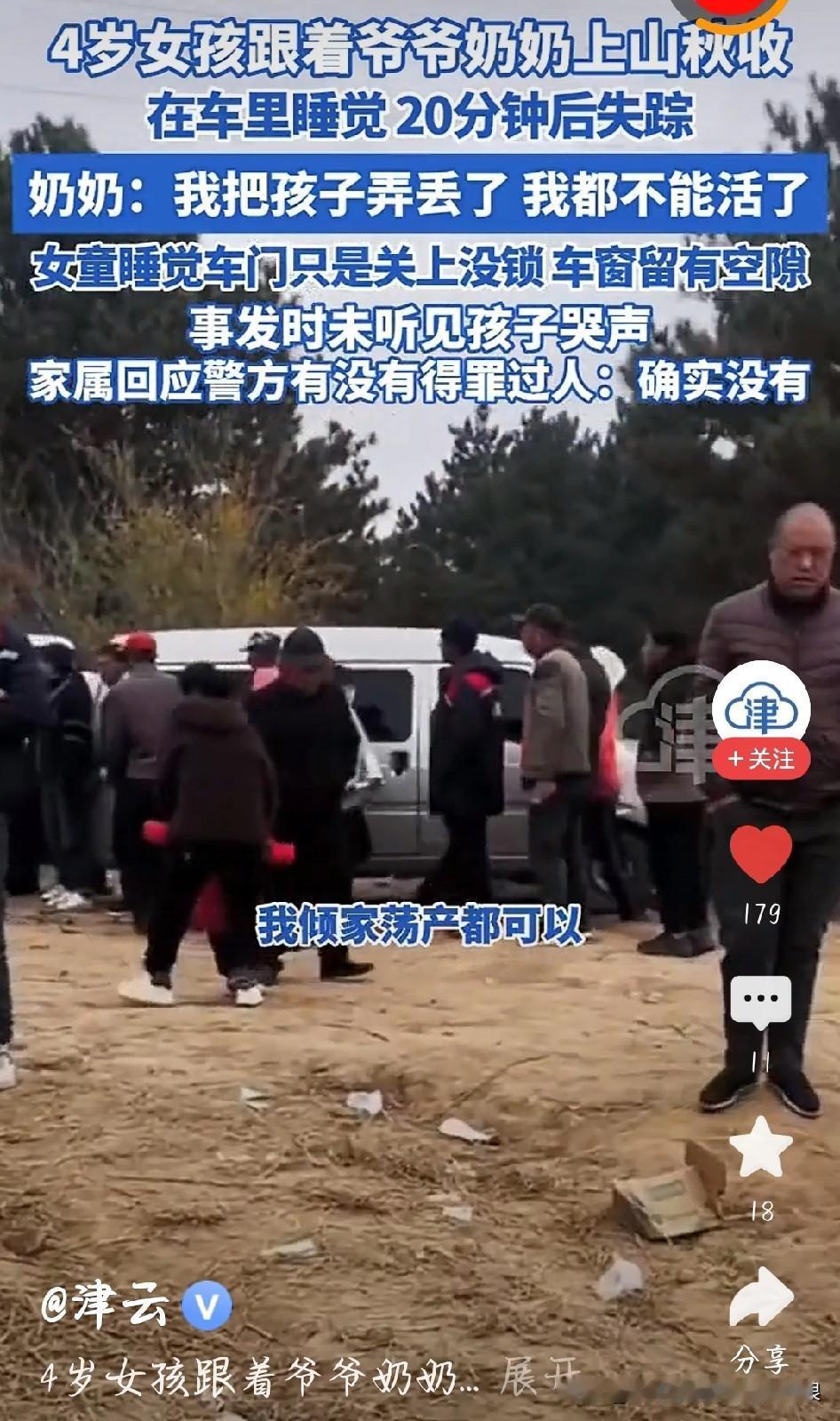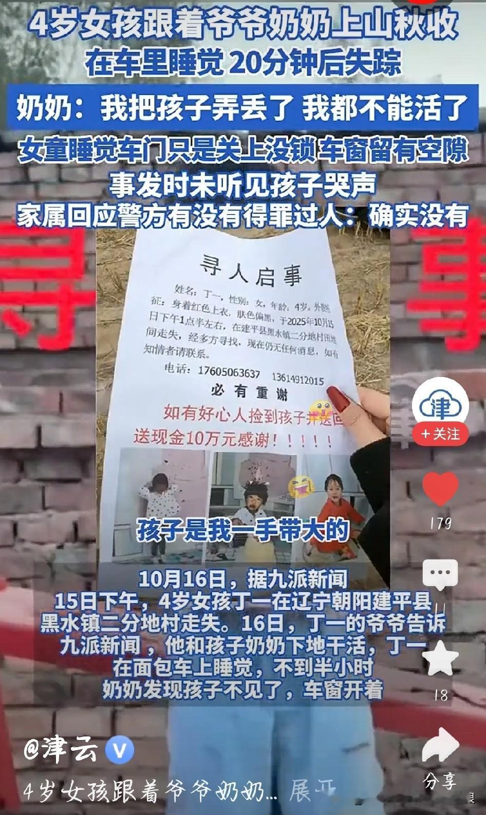 揪心!辽宁4岁女童车内睡一觉没了,上千人找了两天还没影 辽宁朝阳这事儿看得人心里发紧!4岁的小丫头跟着爷爷奶奶去地里收秋,在车上睡着了,老人就把她留车里,自己去200米外干活。 20分钟前看还睡得好好的,半小时后再回来,孩子没了!车门没开,原本关着的车窗却开了大半。爷爷急得直跺脚,怀疑是被人抱走了。 孩子爸妈在外地打工,接到信儿连夜往回赶,爸爸说搜救犬追到马路就不动了,现在悬赏10万找孩子。当地上千人连着两天搜,无人机、热成像都用上了,方圆几公里的山、梯田翻了好几遍,连30米的悬崖和老鹰洞都查了,还是没线索。 这两天气温低,夜里都快零下了,孩子就穿件红上衣,想想都揪心。真心盼着有好心人能提供线索,让孩子早点回家!也提醒家长,千万别把娃单独留车里啊!辽宁黑水镇一4岁女童失联 辽宁女童车内睡觉后失踪 姑姑发声 女童车内失踪 爷爷怀疑睡着时被抱走 四岁女孩 图片截图于网络