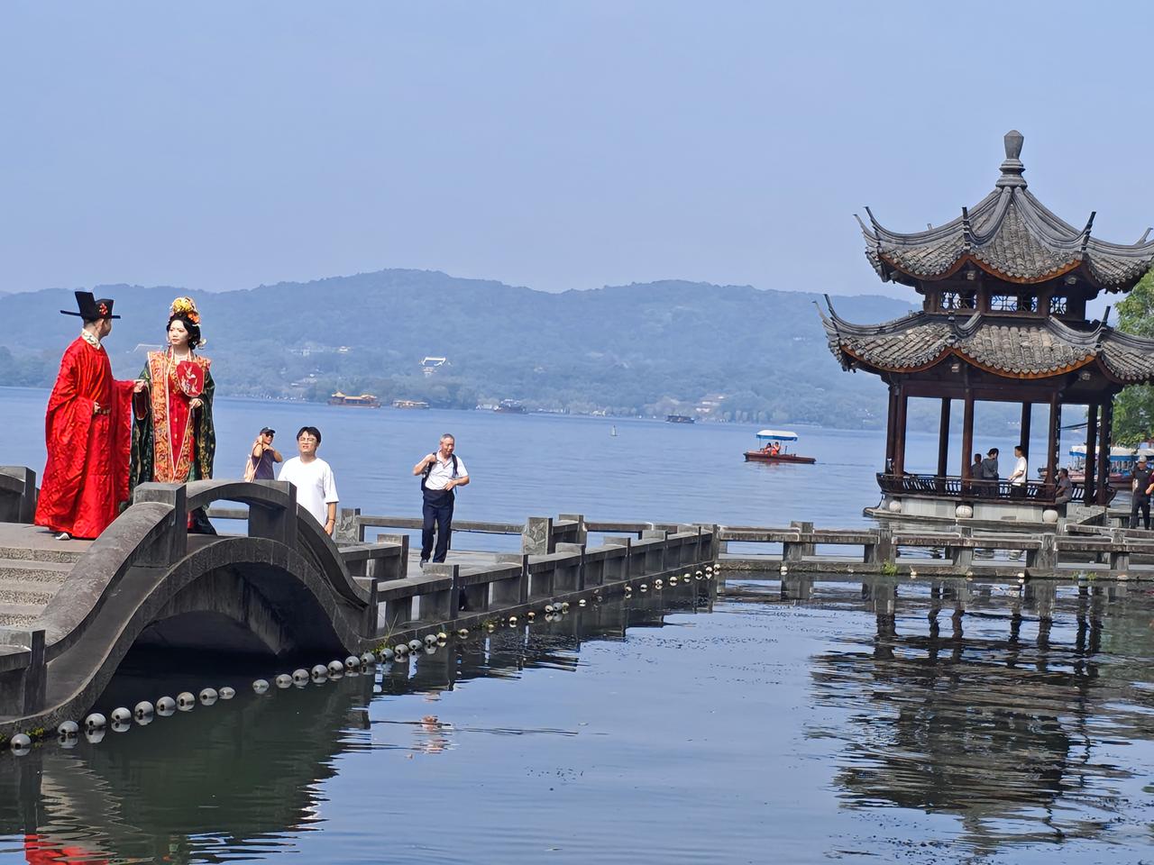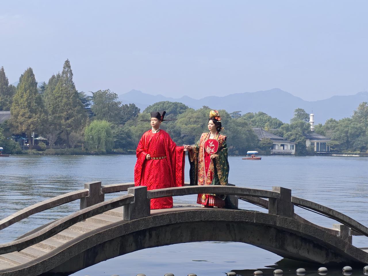 我的今日状态:😎自信酷炫 我这里的天气:🌤️多云 每当我来到雷峰塔看到新人们拍摄婚纱照喜气洋洋的场面总是感慨万千,新人们带着对以后美好生活的向往,脸上洋溢着幸福的笑容时刻感动着我。 我真心希望新人的爱情保鲜期能够长一点,都能有个善始善终的爱情结局!