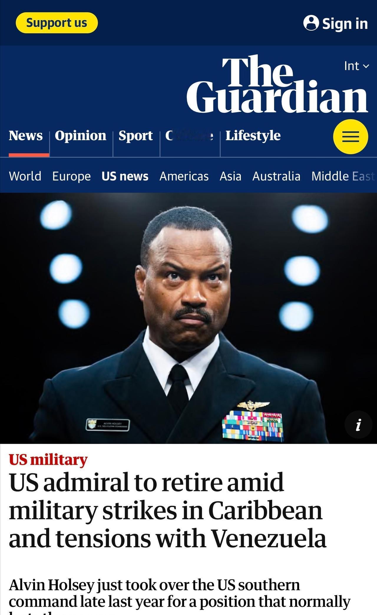 日前美国战争部长赫格赛斯在社交媒体宣布:美军南方司令部司令阿尔文·霍尔西海军四星上将将退出现役并辞去职务,官方理由是“决定退休”。有媒体猜测霍尔西在委内瑞拉问题上与赫格赛斯的冲突是主要原因。